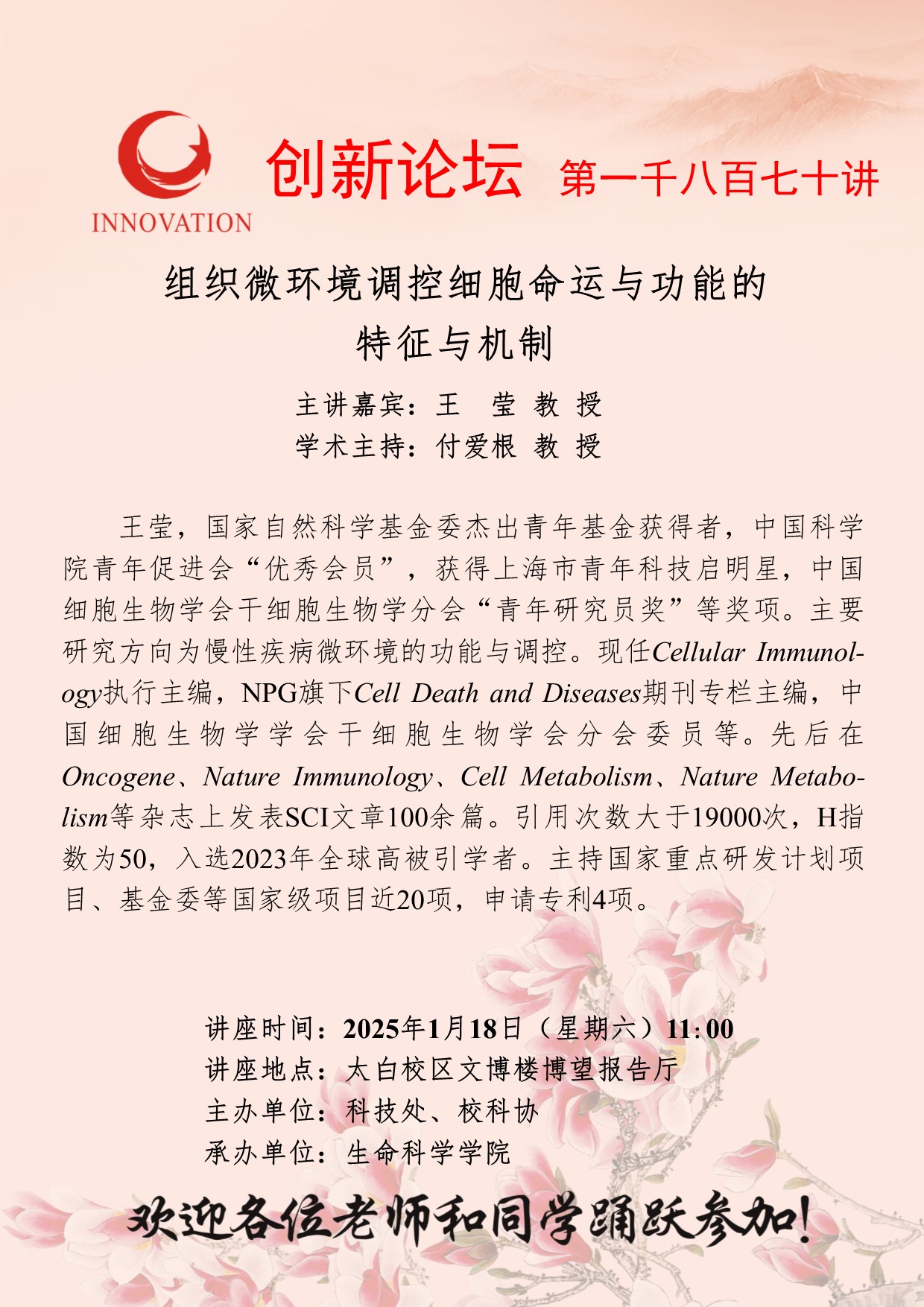 王莹 教授 伟德国际1949始于英国创新论坛第一千八百七十讲:组织微环境调控细胞命运与功能的特征与机制 讲座时间 2025年1月18日(星期六)11:00 讲座地点 太白校区文博楼博望报告厅 讲座人介绍 王莹 教授 讲座内容