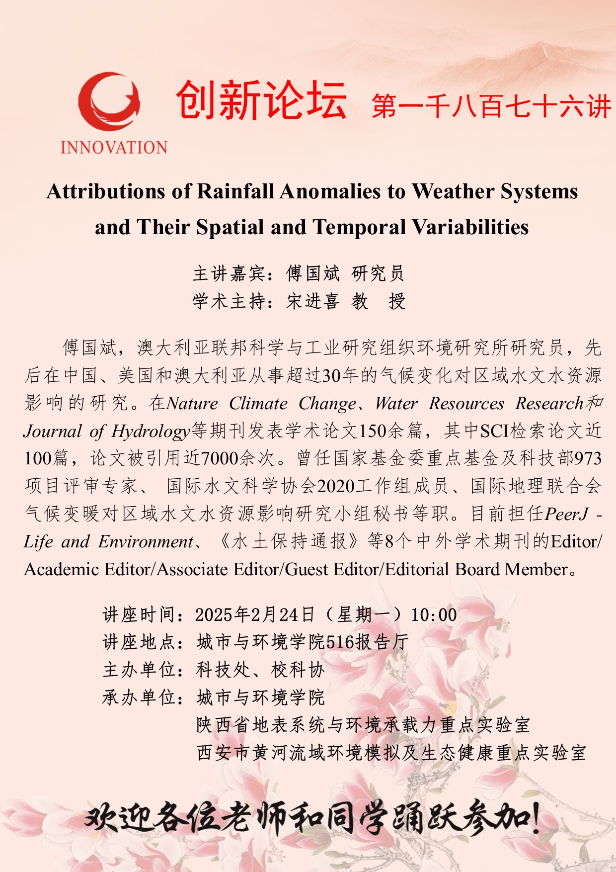 傅国斌 研究员 伟德国际1949始于英国创新论坛第一千八百七十六讲:Attributions of Rainfall Anomalies to Weather Systems and Their Spatial and Temporal Variabilities 讲座时间 2025年2月24日(星期一)10:00 讲座地点 城市与环境学院516报告厅 讲座人介绍 傅国斌 研究员 讲座内容