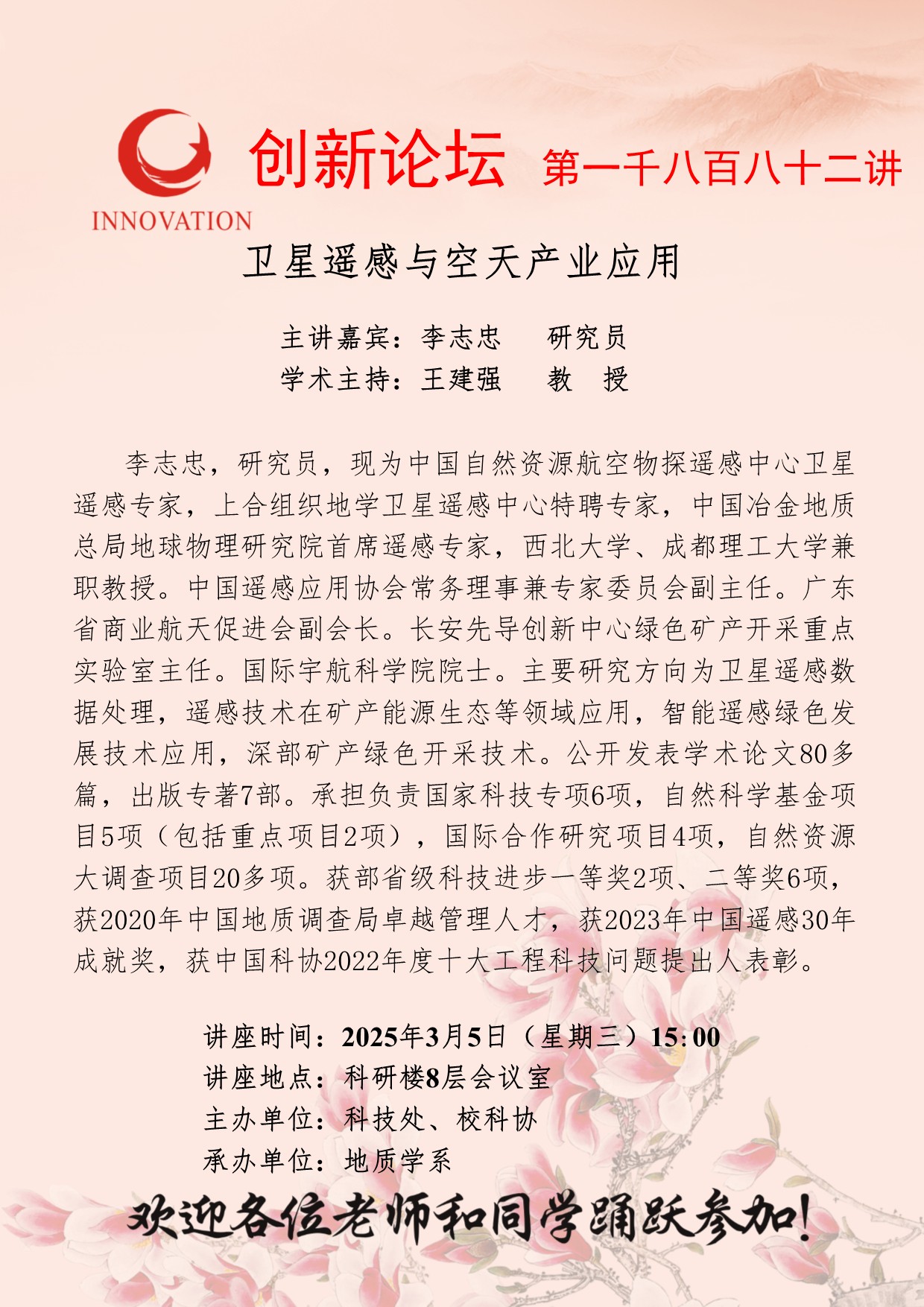 李志忠 研究员 伟德国际1949始于英国创新论坛第一千八百八十二讲:卫星遥感与空天产业应用 讲座时间 2025年3月5日(星期三)15:00 讲座地点 科研楼8层会议室 讲座人介绍 李志忠 研究员 讲座内容