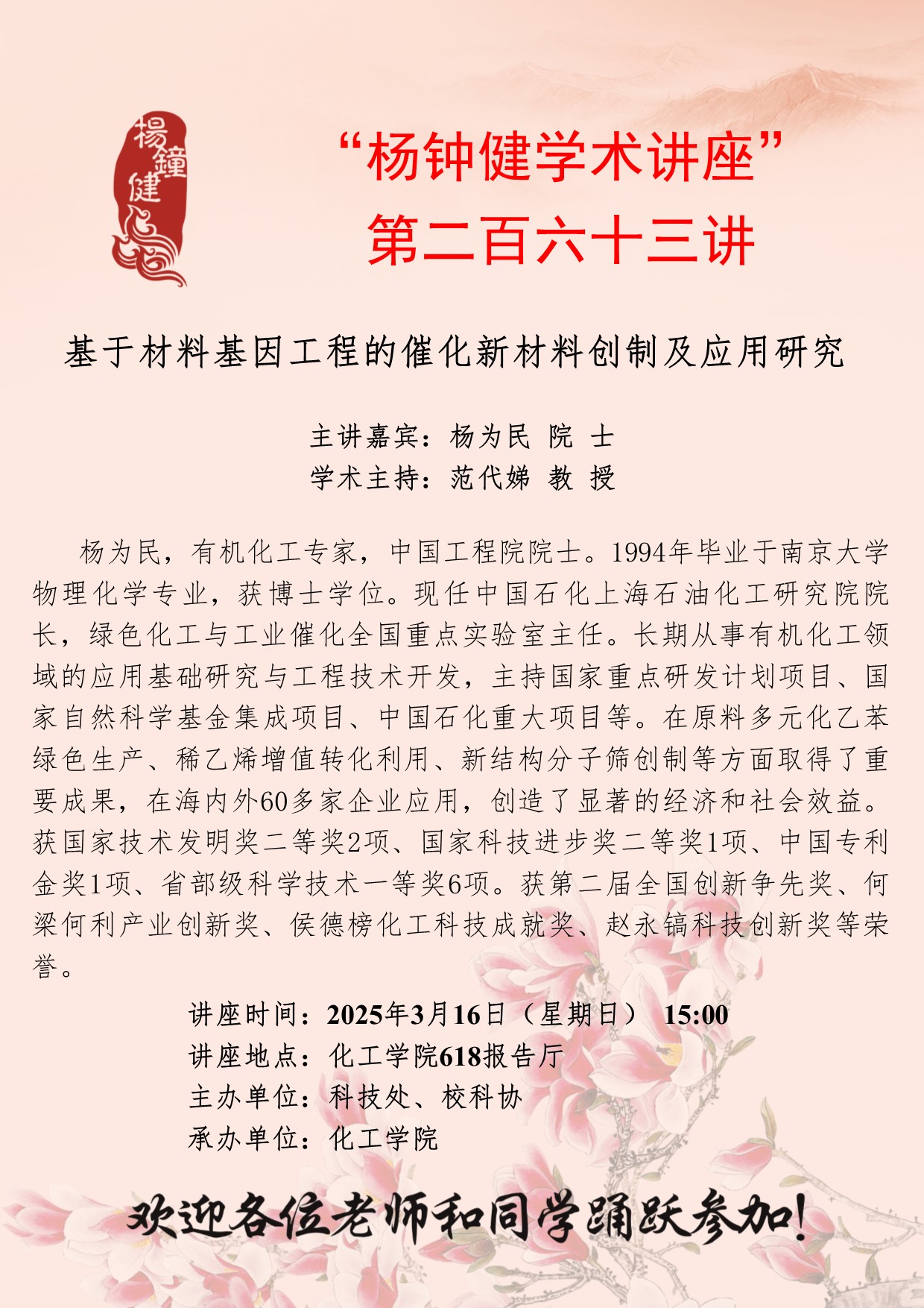 “杨钟健学术讲座”第二百六十三讲:基于材料基因工程的催化新材料创制及应用研究