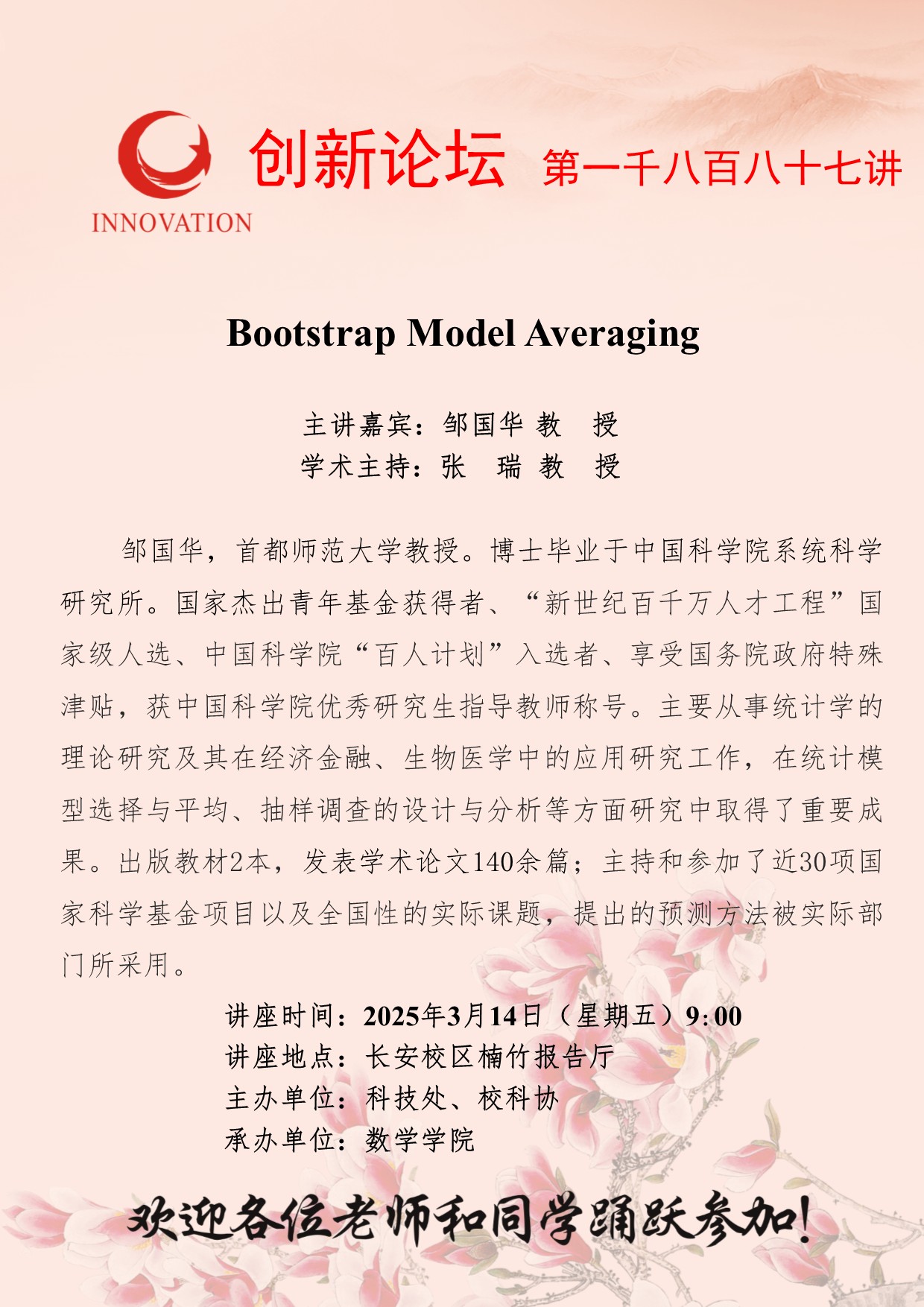邹国华 教授 伟德国际1949始于英国创新论坛第一千八百八十七讲:Bootstrap Model Averaging 讲座时间 2025年3月14日(星期五)9:00 讲座地点 长安校区楠竹报告厅 讲座人介绍 邹国华 教授 讲座内容