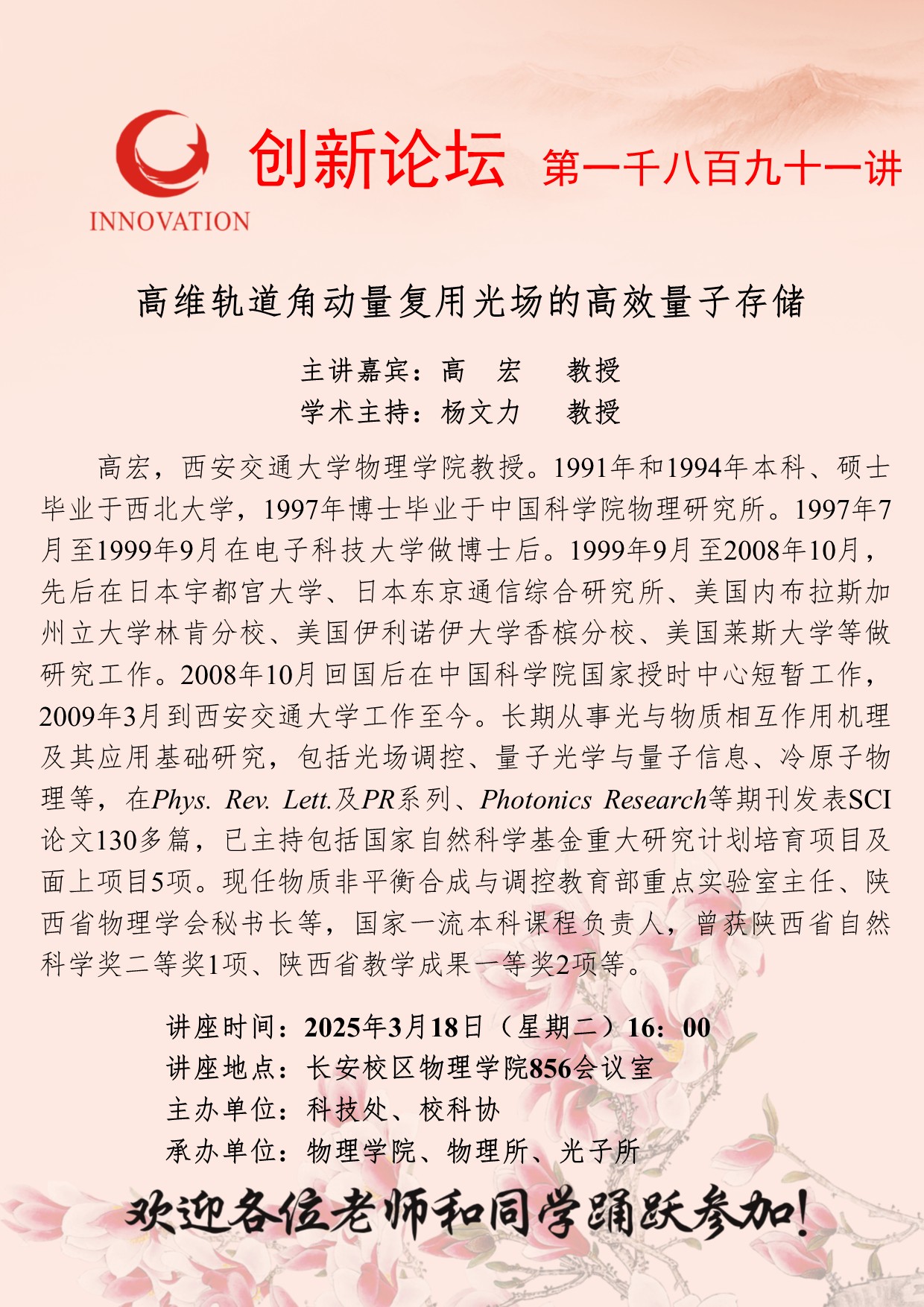 高宏 教授 伟德国际1949始于英国创新论坛第一千八百九十一讲:高维轨道角动量复用光场的高效量子存储 讲座时间 2025年3月18日(星期二)16:00 讲座地点 长安校区物理学院856会议室 讲座人介绍 高宏 教授 讲座内容