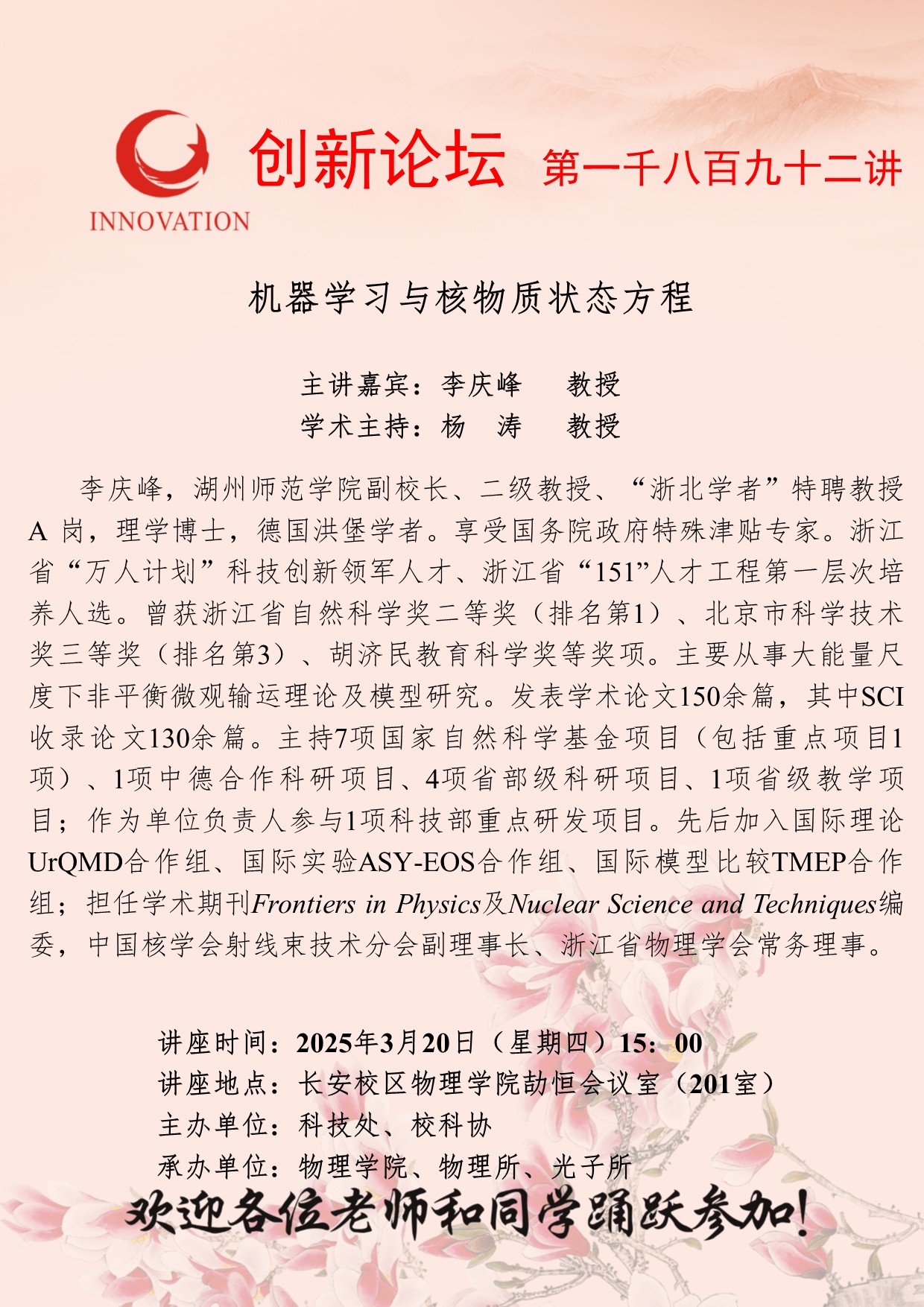 李庆峰 教授 伟德国际1949始于英国创新论坛第一千八百九十二讲:机器学习与核物质状态方程 讲座时间 2025年3月20日(星期四)15:00 讲座地点 长安校区物理学院劼恒会议室(201室) 讲座人介绍 李庆峰 教授 讲座内容