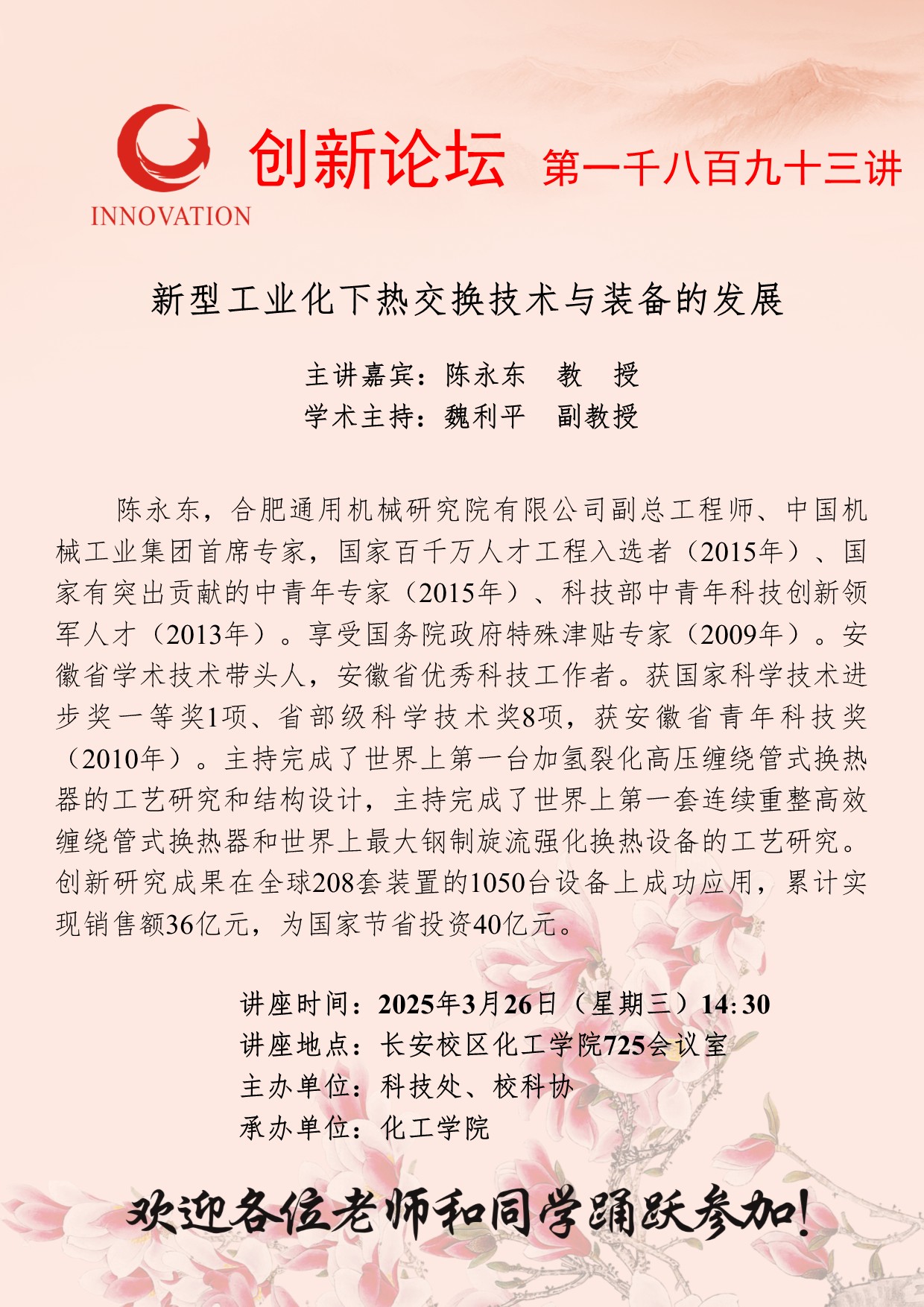 陈永东 教授 伟德国际1949始于英国创新论坛第一千八百九十三讲:新型工业化下热交换技术与装备的发展 讲座时间 2025年3月26日(星期三)14:30 讲座地点 长安校区化工学院725会议室 讲座人介绍 陈永东 教授 讲座内容