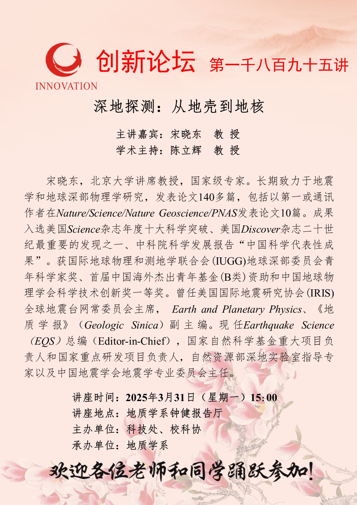 宋晓东 教授 伟德国际1949始于英国创新论坛第一千八百九十五讲:深地探测:从地壳到地核 讲座时间 2025年3月31日(星期一)15:00 讲座地点 地质学系钟健报告厅 讲座人介绍 宋晓东 教授 讲座内容
