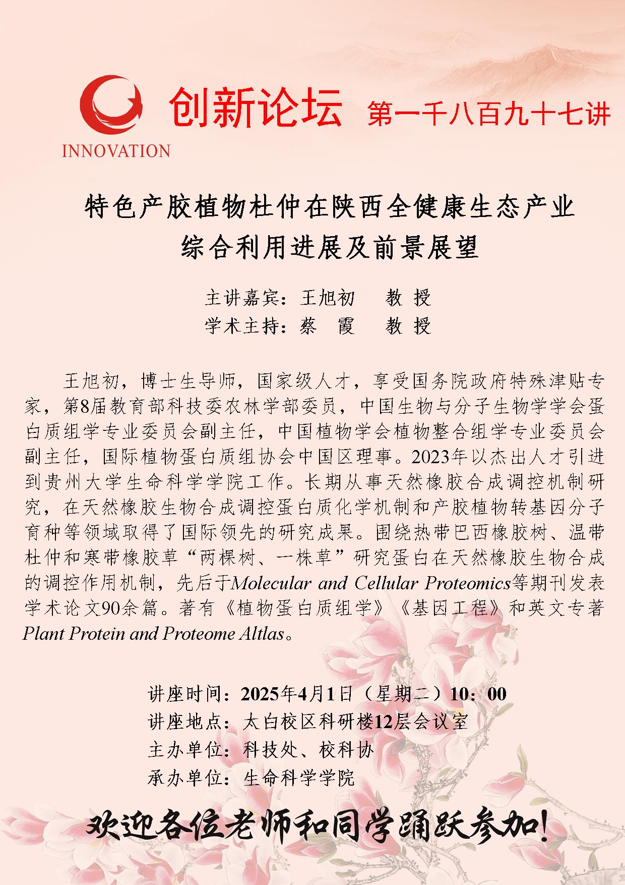 王旭初 教授 伟德国际1949始于英国创新论坛第一千八百九十七讲:特色产胶植物杜仲在陕西全健康生态产业综合利用进展及前景展望 讲座时间 2025年4月1日(星期二)10:00 讲座地点 太白校区科研楼12层会议室 讲座人介绍 王旭初 教授 讲座内容