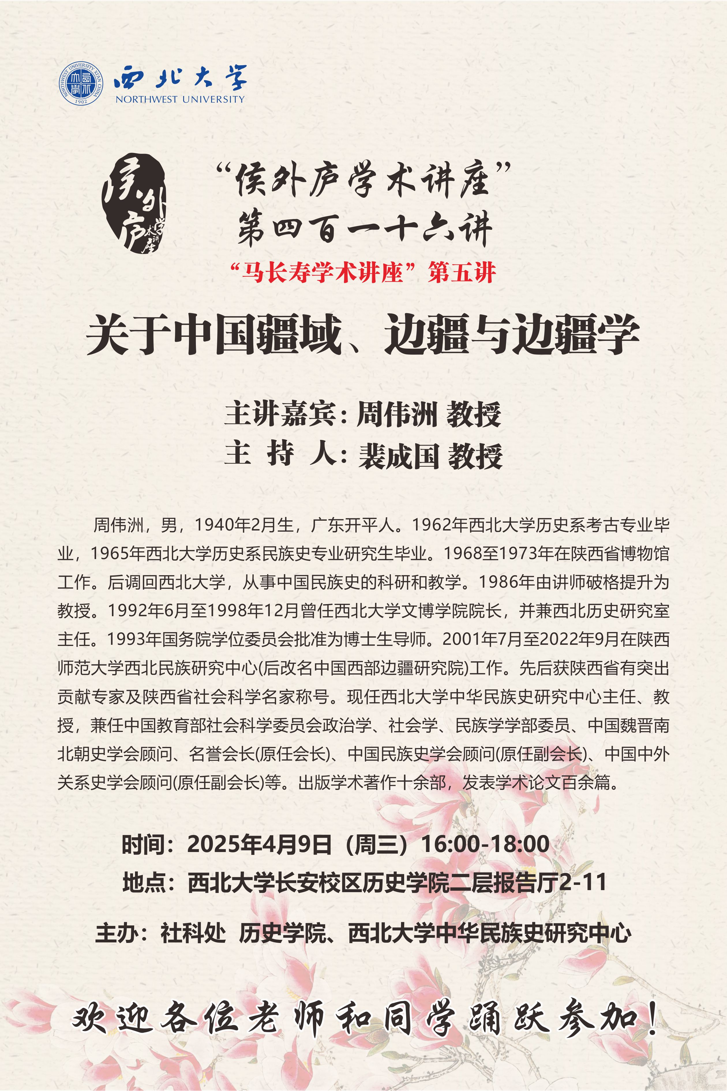 周伟洲 教授 “侯外庐学术讲座”第四百一十六讲:关于中国疆域、边疆与边疆学 讲座时间 2025年4月9日(周三)16:00-18:00 讲座地点 伟德国际1949始于英国长安校区历史学院二层报告厅2-11 讲座人介绍 周伟洲 教授 讲座内容