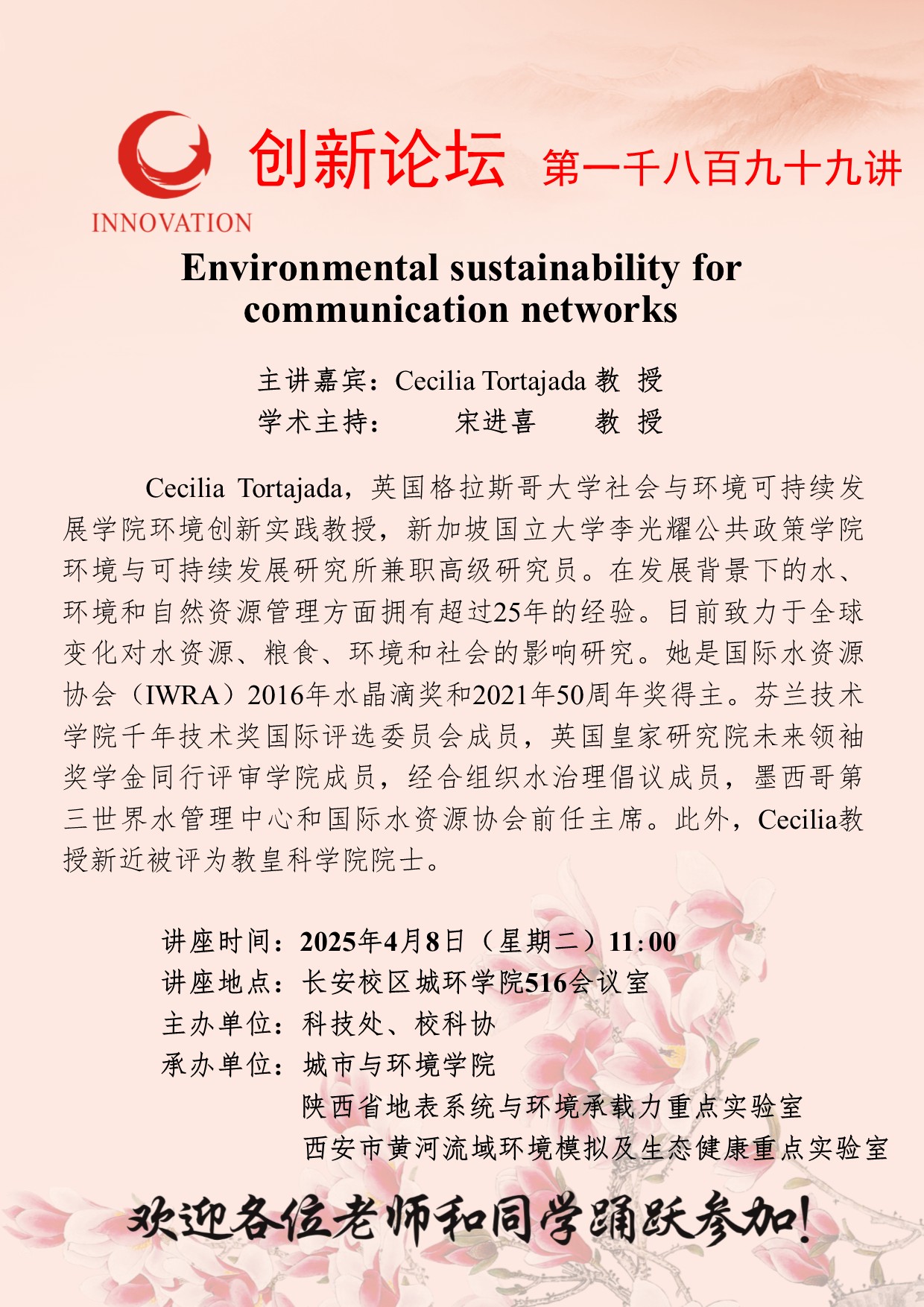 Cecilia Tortajada 教授 伟德国际1949始于英国创新论坛第一千八百九十九讲:Environmental sustainability for communication networks 讲座时间 2025年4月8日(星期二)11:00 讲座地点 长安校区城环学院516会议室 讲座人介绍 Cecilia Tortajada 教授 讲座内容