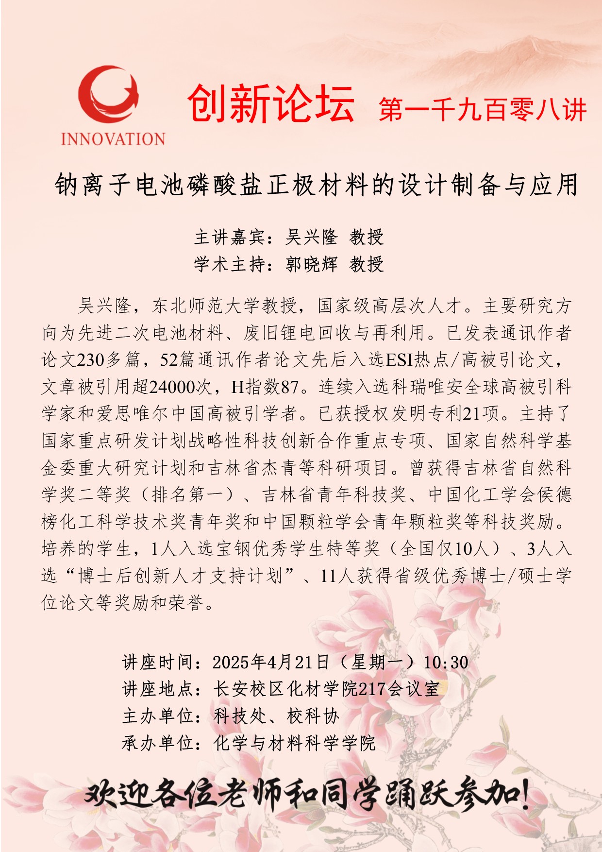 吴兴隆 教授 伟德国际1949始于英国创新论坛第一千九百零八讲:钠离子电池磷酸盐正极材料的设计制备与应用 讲座时间 2025年4月21日(星期一)10:30 讲座地点 长安校区化材学院217会议室 讲座人介绍 吴兴隆 教授 讲座内容