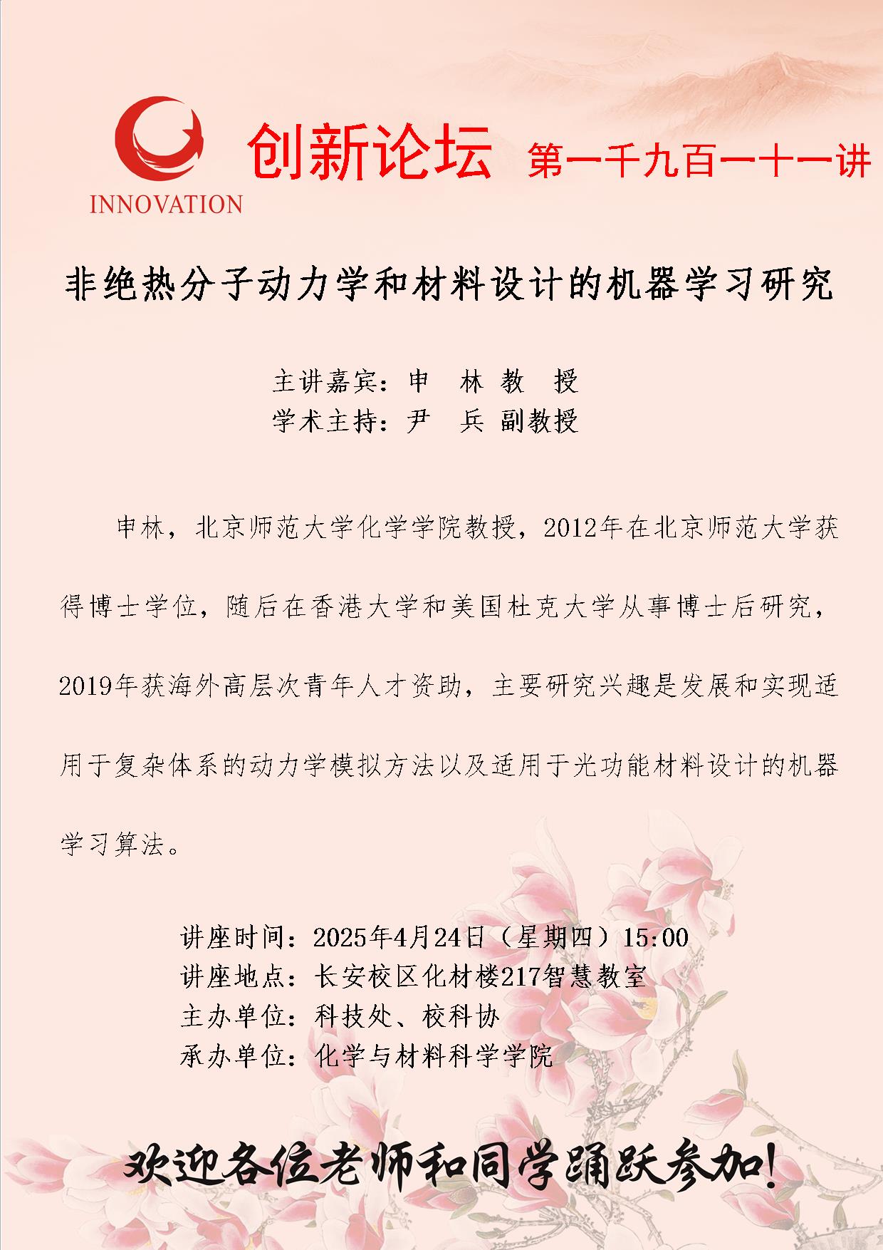 申林 教授 伟德国际1949始于英国创新论坛第一千九百一十一讲:非绝热分子动力学和材料设计的机器学习研究 讲座时间 2025年4月24日(星期四)15:00 讲座地点 长安校区化材楼217智慧教室 讲座人介绍 申林 教授 讲座内容