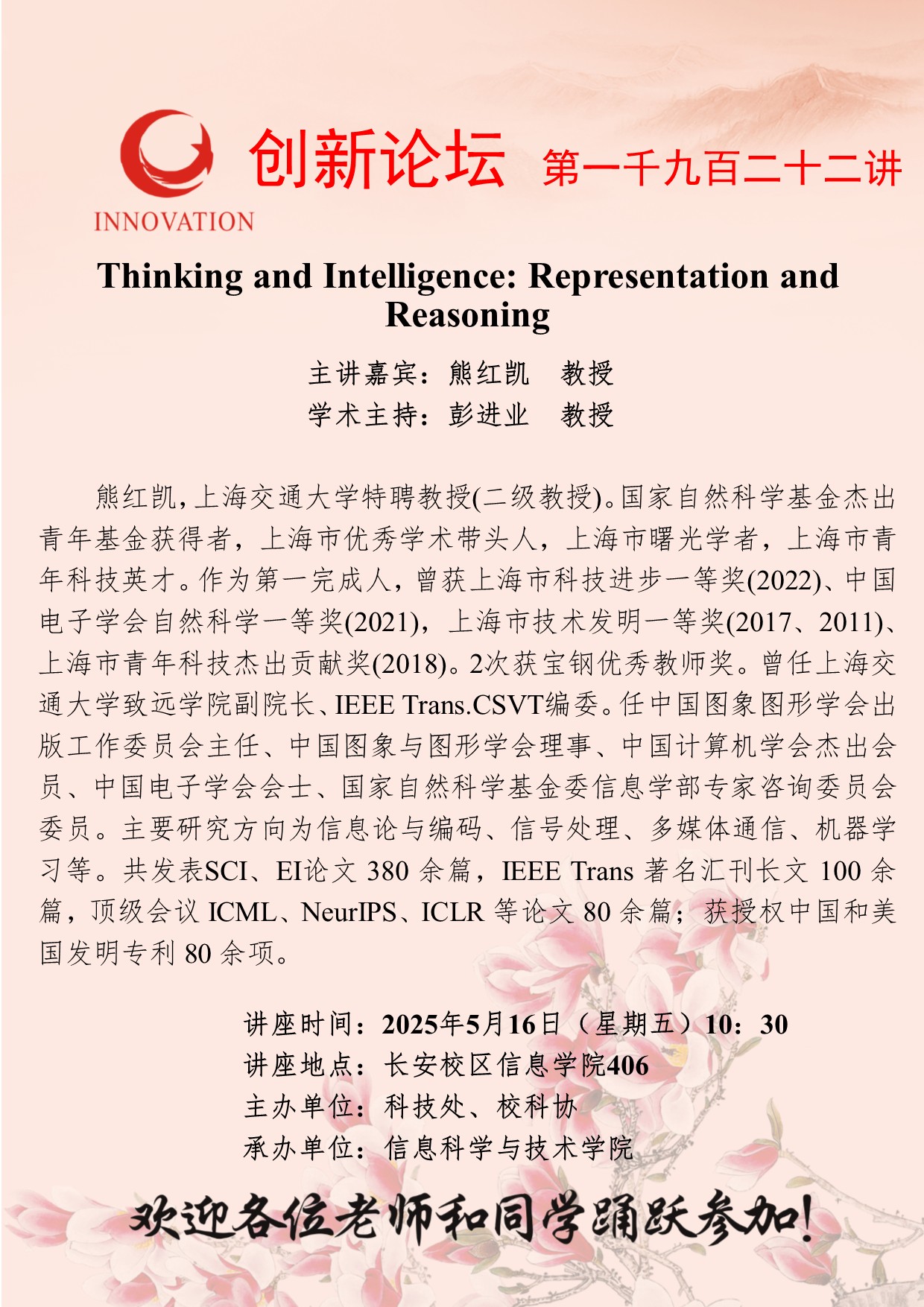 熊红凯 教授 伟德国际1949始于英国创新论坛第一千九百二十二讲:Thinking and Intelligence: Representation and Reasoning 讲座时间 2025年5月16日(星期五)10:30 讲座地点 长安校区信息学院406 讲座人介绍 熊红凯 教授 讲座内容