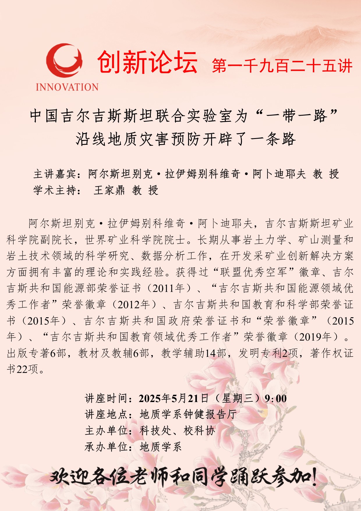 阿尔斯坦别克·拉伊姆别科维奇·阿卜迪耶夫 教授 伟德国际1949始于英国创新论坛第一千九百二十五讲:中国吉尔吉斯斯坦联合实验室为“一带一路”沿线地质灾害预防开辟了一条路 讲座时间 2025年5月21日(星期三)9:00 讲座地点 地质学系钟健报告厅 讲座人介绍 阿尔斯坦别克·拉伊姆别科维奇·阿卜迪耶夫 教授 讲座内容