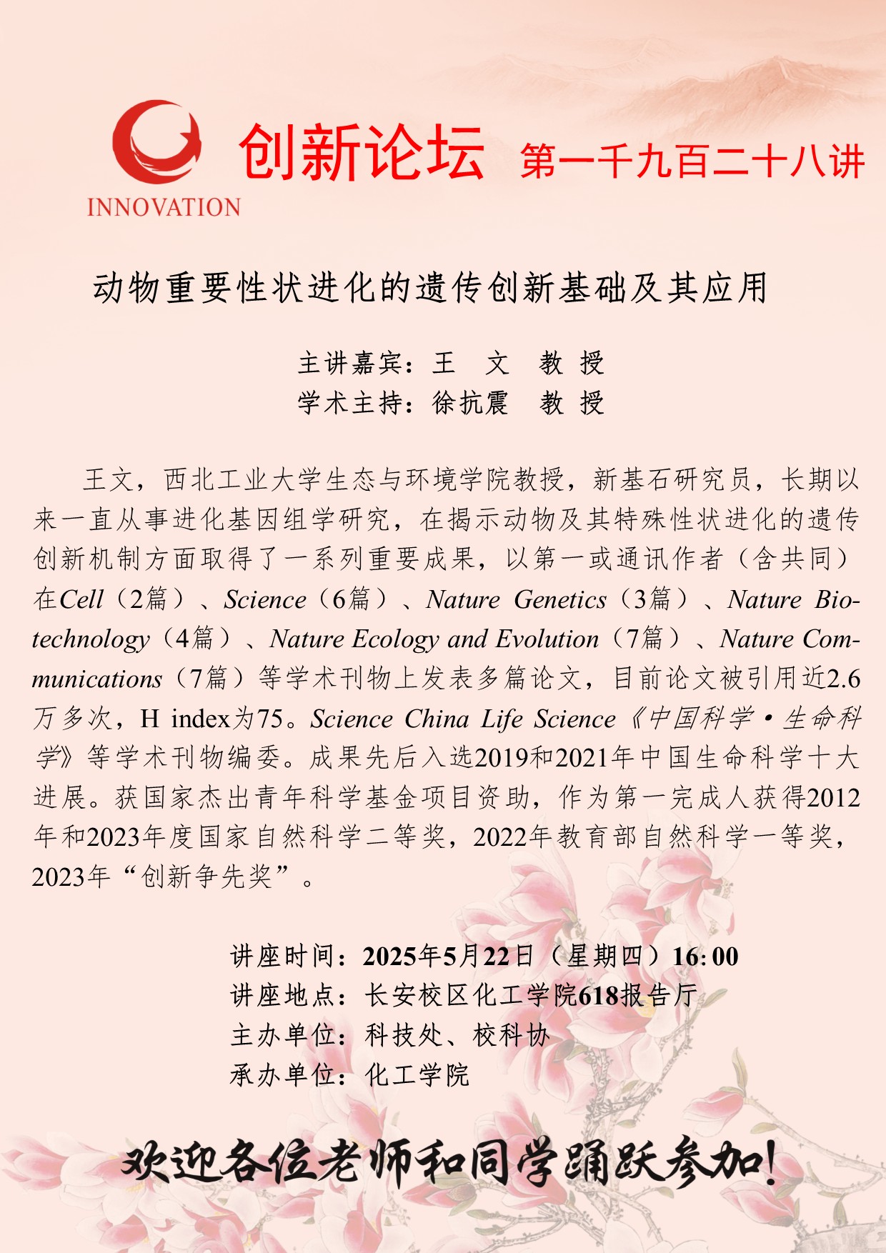 王文 教授 伟德国际1949始于英国创新论坛第一千九百二十八讲:动物重要性状进化的遗传创新基础及其应用 讲座时间 2025年5月22日(星期四)16:00 讲座地点 长安校区化工学院618报告厅 讲座人介绍 王文 教授 讲座内容