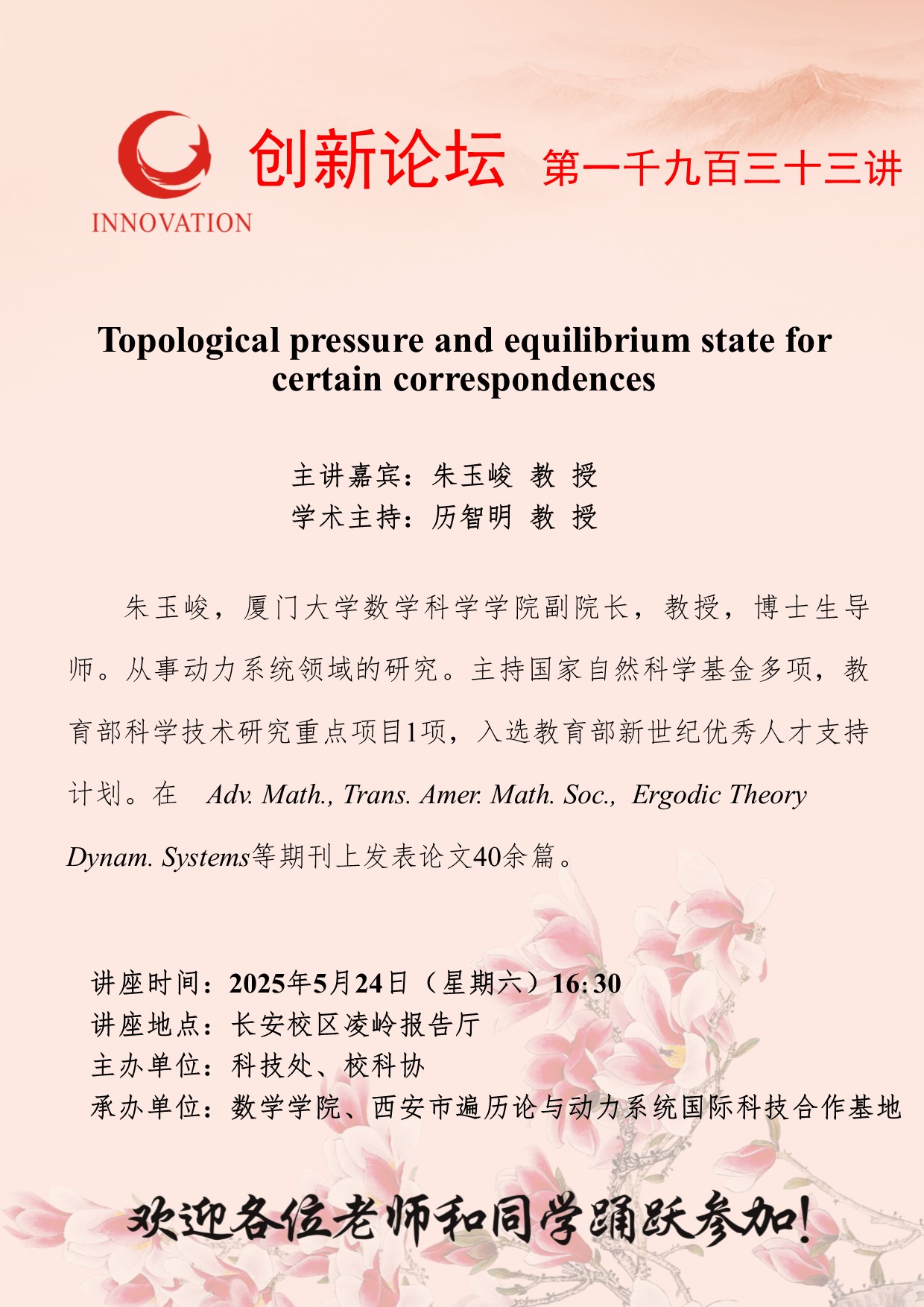 朱玉峻 教授 伟德国际1949始于英国创新论坛第一千九百三十三讲:Topological pressure and equilibrium state for certain correspondences 讲座时间 2025年5月24日(星期六)16:30 讲座地点 长安校区凌岭报告厅 讲座人介绍 朱玉峻 教授 讲座内容