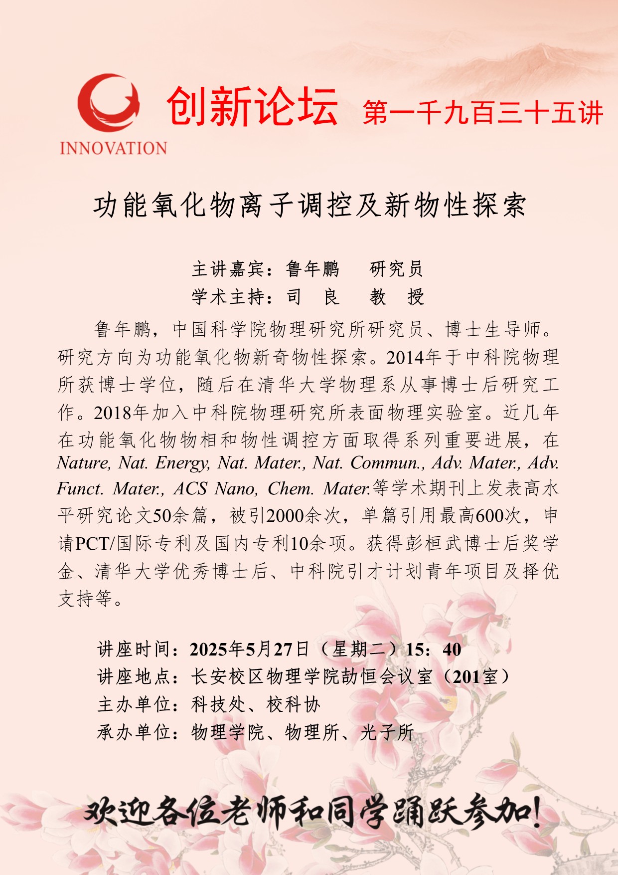 鲁年鹏 研究员 伟德国际1949始于英国创新论坛第一千九百三十五讲:功能氧化物离子调控及新物性探索 讲座时间 2025年5月27日(星期二)15:40 讲座地点 长安校区物理学院劼恒会议室(201室) 讲座人介绍 鲁年鹏 研究员 讲座内容