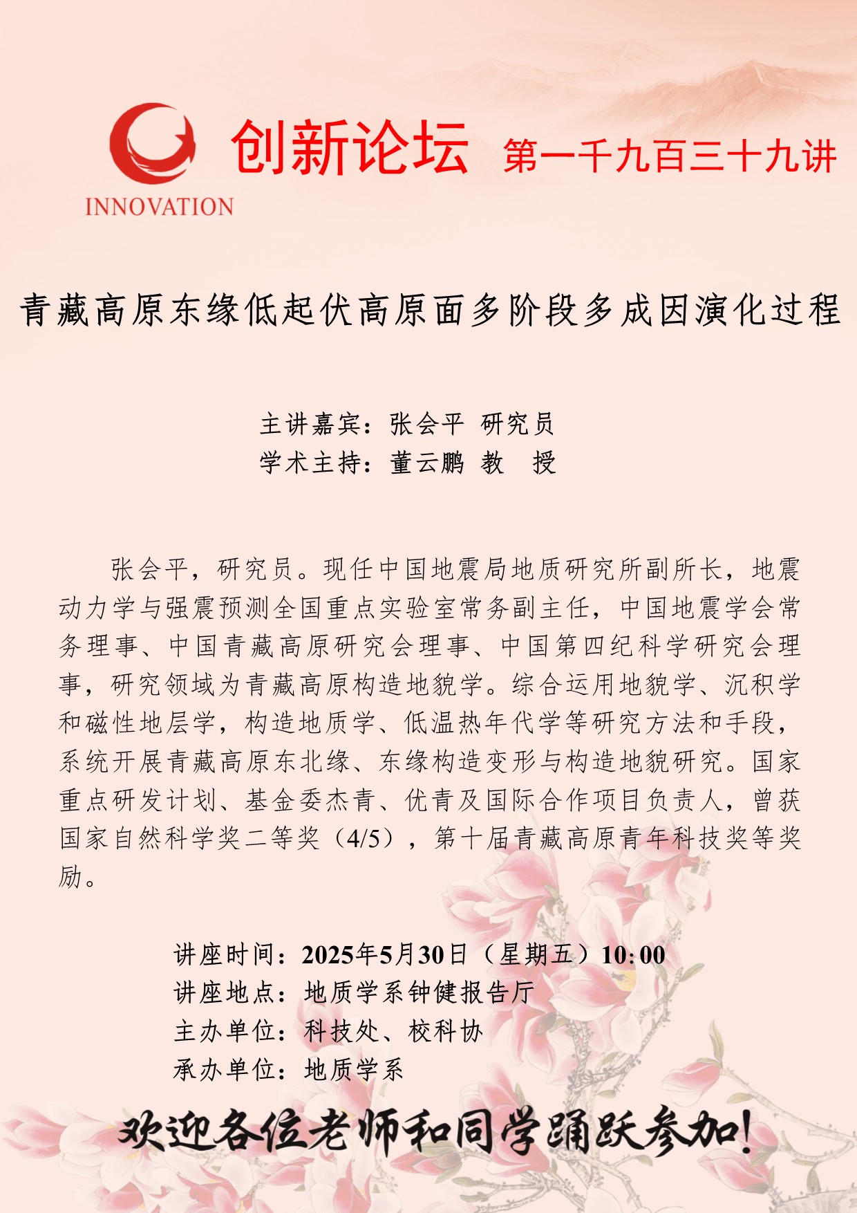 张会平 研究员 伟德国际1949始于英国创新论坛第一千九百三十九讲:青藏高原东缘低起伏高原面多阶段多成因演化过程 讲座时间 2025年5月30日(星期五)10:00 讲座地点 地质学系钟健报告厅 讲座人介绍 张会平 研究员 讲座内容
