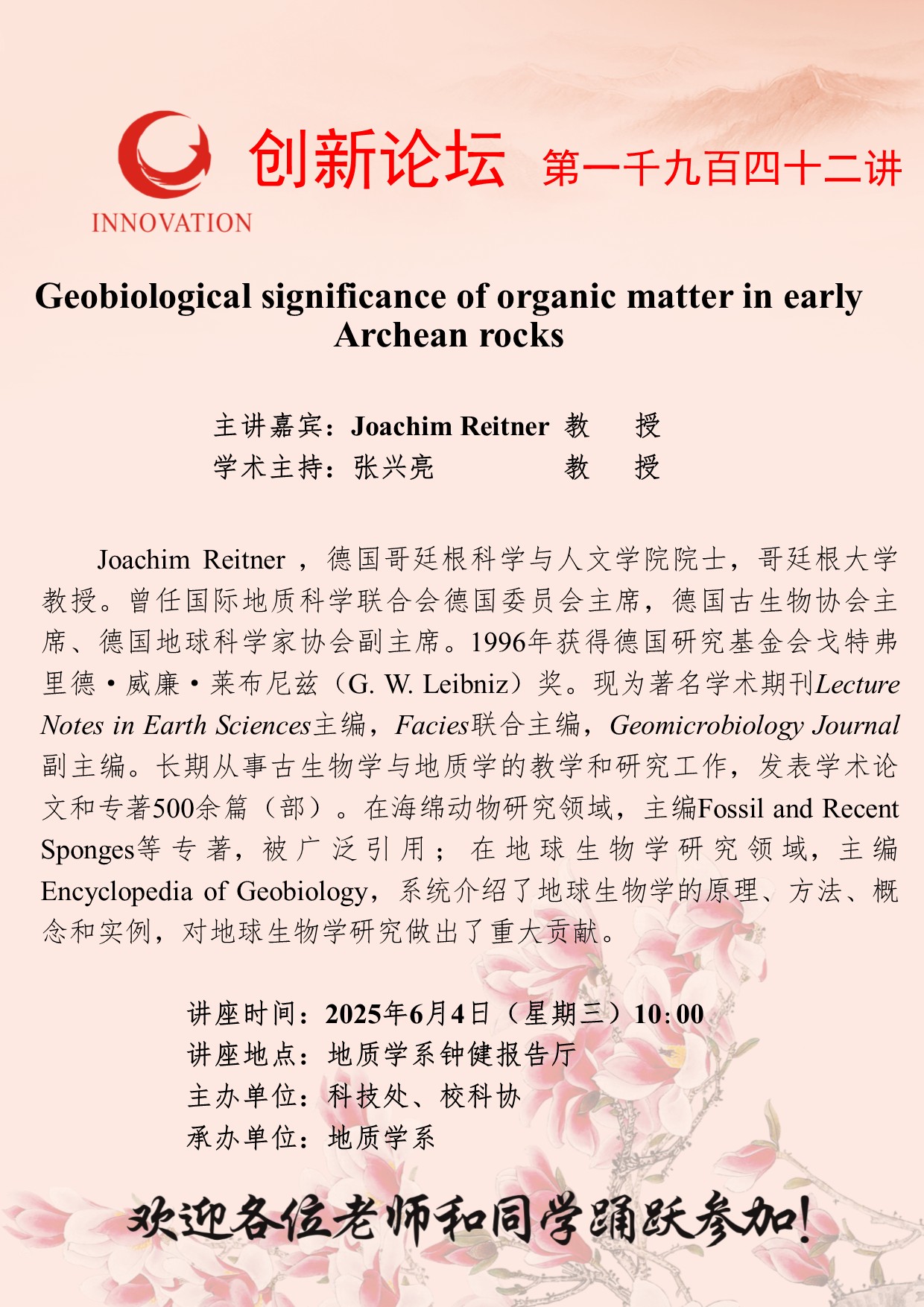 Joachim Reitner 教授 伟德国际1949始于英国创新论坛第一千九百四十二讲:Geobiological significance of organic matter in early Archean rocks 讲座时间 2025年6月4日(星期三)10:00 讲座地点 地质学系钟健报告厅 讲座人介绍 Joachim Reitner 教授 讲座内容