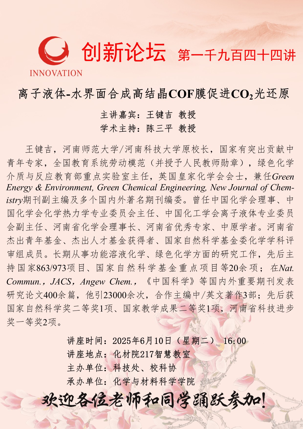 王键吉 教授 伟德国际1949始于英国创新论坛第一千九百四十四讲:离子液体-水界面合成高结晶COF膜促进CO2光还原 讲座时间 2025年6月10日(星期二) 16:00 讲座地点 化材院217智慧教室 讲座人介绍 王键吉 教授 讲座内容