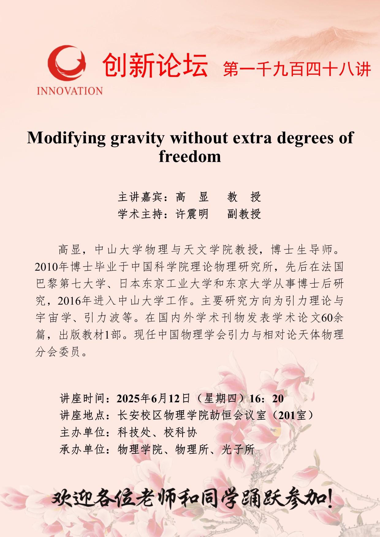高显 教授 伟德国际1949始于英国创新论坛第一千九百四十八讲:Modifying gravity without extra degrees of freedom 讲座时间 2025年6月12日(星期四)16:20 讲座地点 长安校区物理学院劼恒会议室(201室) 讲座人介绍 高显 教授 讲座内容