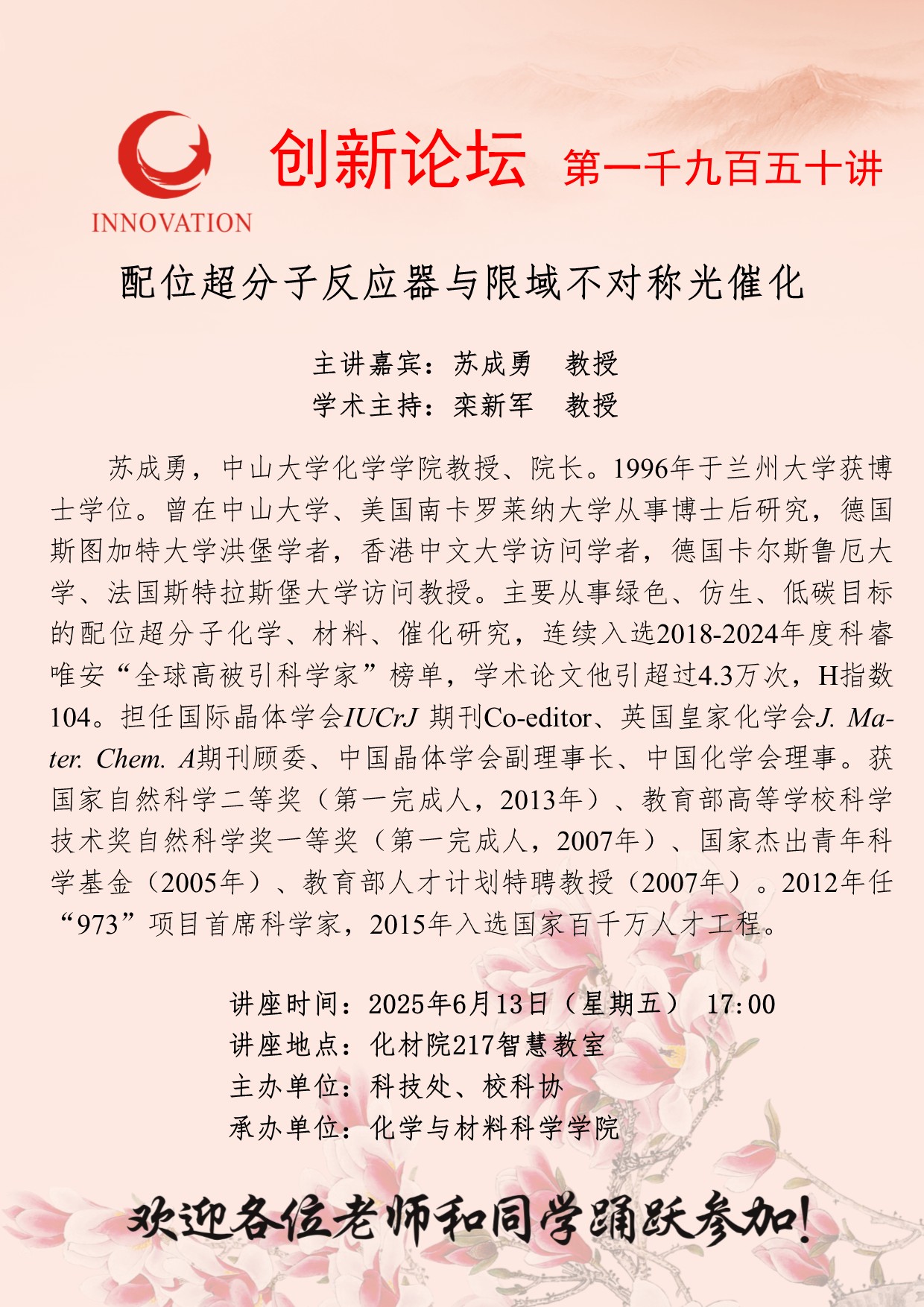 苏成勇 教授 伟德国际1949始于英国创新论坛第一千九百五十讲:配位超分子反应器与限域不对称光催化 讲座时间 2025年6月13日(星期五) 17:00 讲座地点 化材院217智慧教室 讲座人介绍 苏成勇 教授 讲座内容
