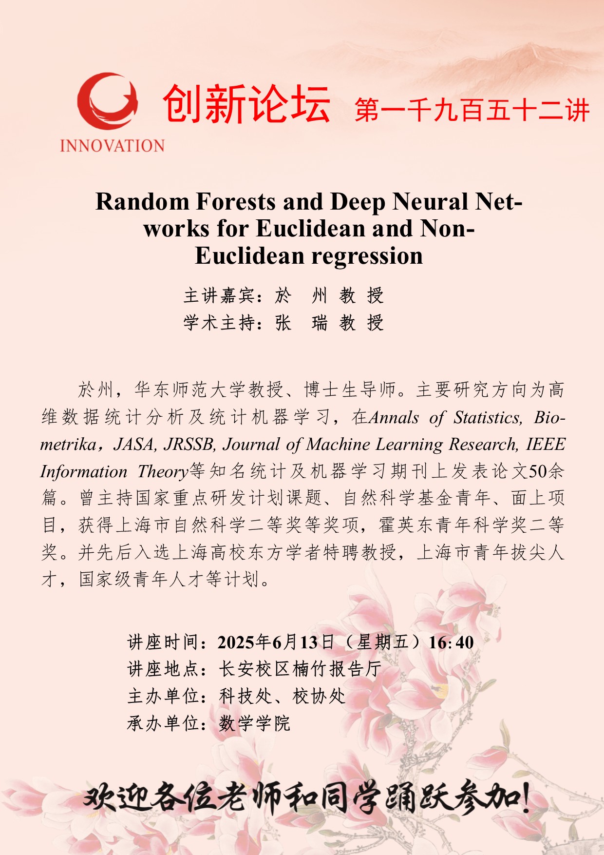 於州 教授 伟德国际1949始于英国创新论坛第一千九百五十二讲:Random Forests and Deep Neural Networks for Euclidean and Non-Euclidean regression 讲座时间 2025年6月13日(星期五)16:40 讲座地点 长安校区楠竹报告厅 讲座人介绍 於州 教授 讲座内容