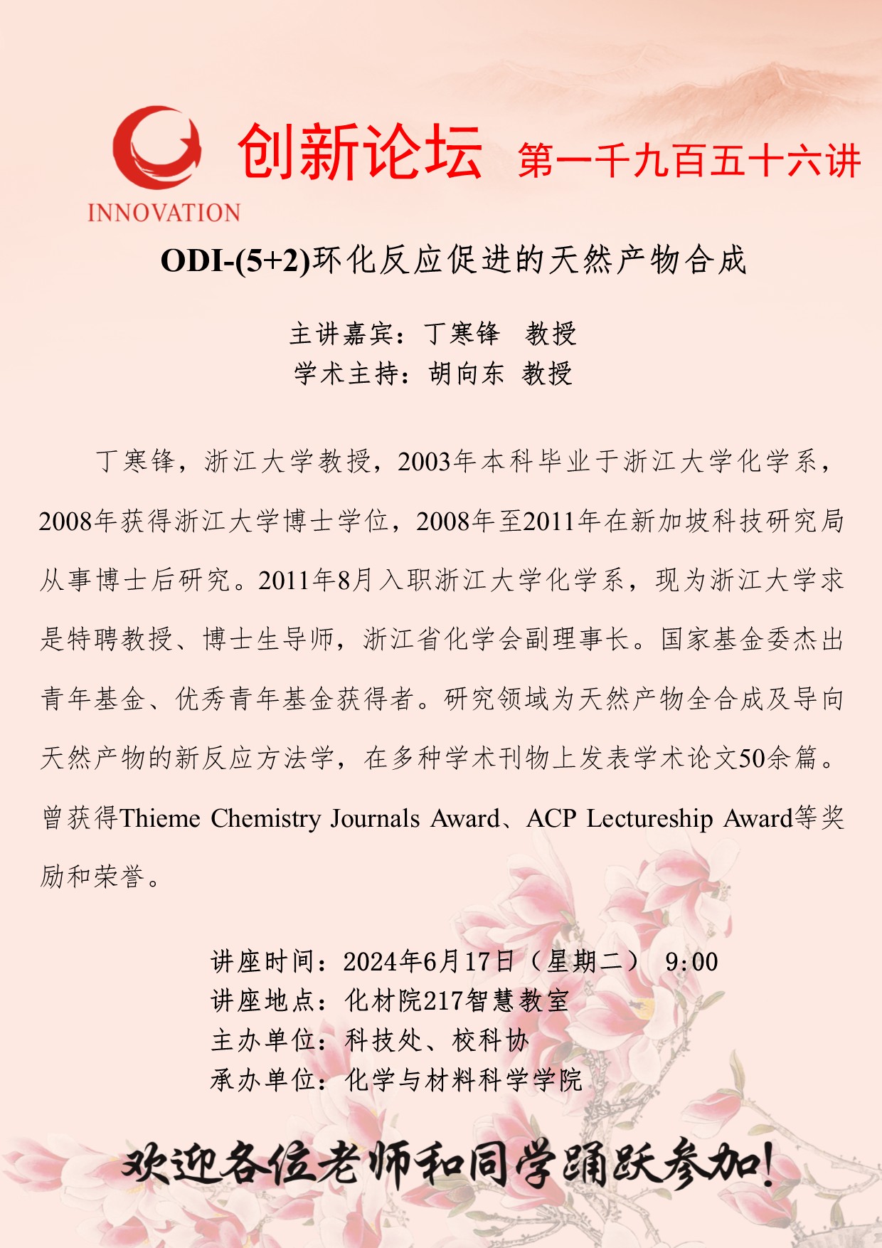 丁寒锋 教授 伟德国际1949始于英国创新论坛第一千九百五十六讲:ODI-(5+2)环化反应促进的天然产物合成 讲座时间 2024年6月17日(星期二) 9:00 讲座地点 化材院217智慧教室 讲座人介绍 丁寒锋 教授 讲座内容