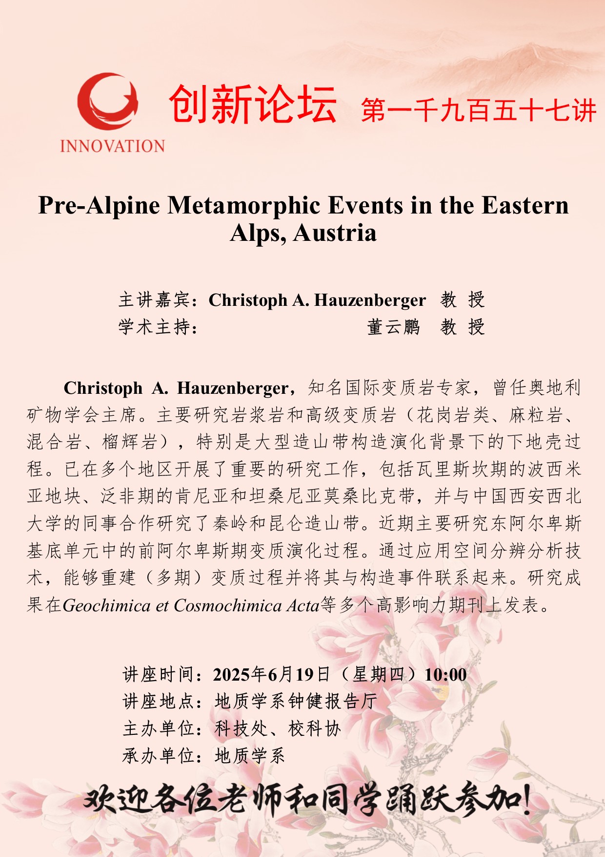 Christoph A. Hauzenberger 教授 伟德国际1949始于英国创新论坛第一千九百五十七讲:Pre-Alpine Metamorphic Events in the Eastern Alps, Austria 讲座时间 2025年6月19日(星期四)10:00 讲座地点 地质学系钟健报告厅 讲座人介绍 Christoph A. Hauzenberger 教授 讲座内容