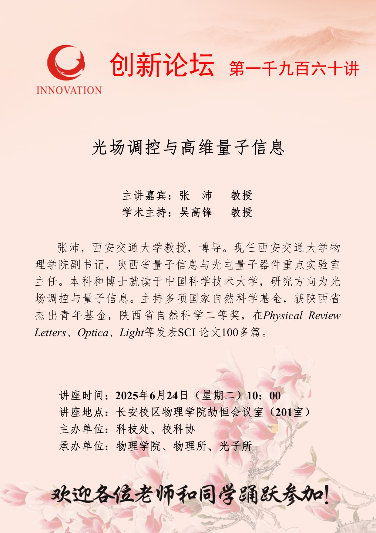 张沛 教授 伟德国际1949始于英国创新论坛第一千九百六十讲:光场调控与高维量子信息 讲座时间 2025年6月24日(星期二)10:00 讲座地点 长安校区物理学院劼恒会议室(201室) 讲座人介绍 张沛 教授 讲座内容