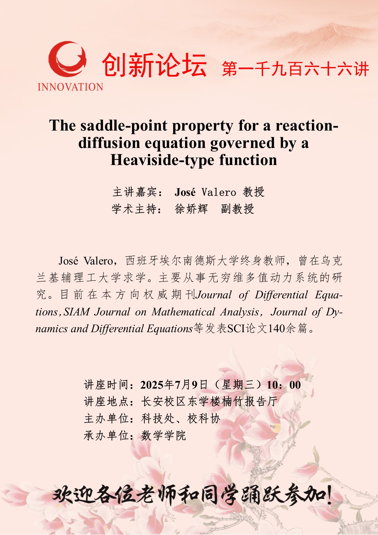 José Valero 教授 伟德国际1949始于英国创新论坛第一千九百六十六讲:The saddle-point property for a reaction-diffusion equation governed by a Heaviside-type function 讲座时间 2025年7月9日(星期三)10:00 讲座地点 长安校区东学楼楠竹报告厅 讲座人介绍 José Valero 教授 讲座内容