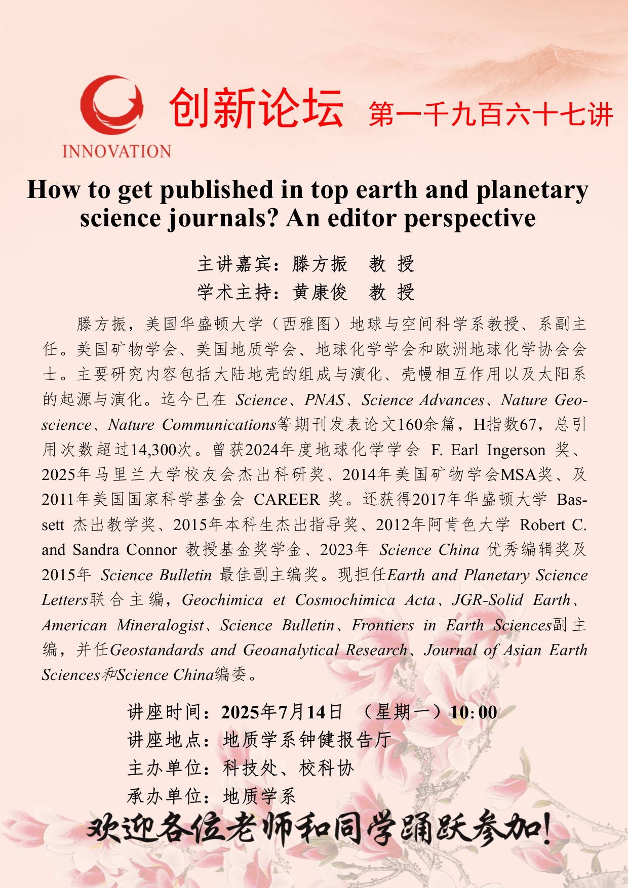 滕方振 教授 伟德国际1949始于英国创新论坛第一千九百六十七讲:How to get published in top earth and planetary science journals? An editor perspective 讲座时间 2025年7月14日 (星期一)10:00 讲座地点 地质学系钟健报告厅 讲座人介绍 滕方振 教授 讲座内容