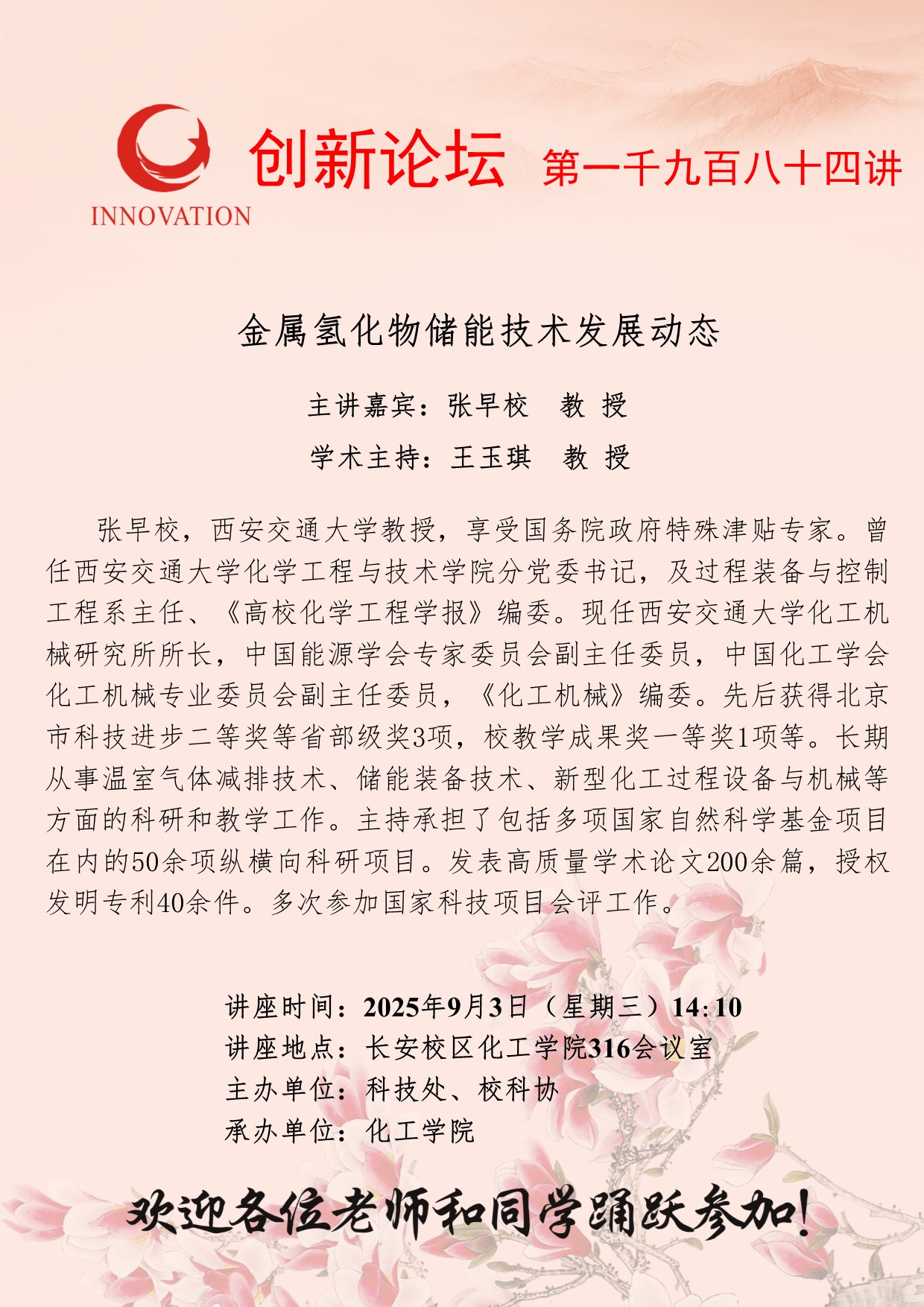张早校 教授 伟德国际1949始于英国创新论坛第一千九百八十四讲:金属氢化物储能技术发展动态 讲座时间 2025年9月3日(星期三)14:10 讲座地点 长安校区化工学院316会议室 讲座人介绍 张早校 教授 讲座内容