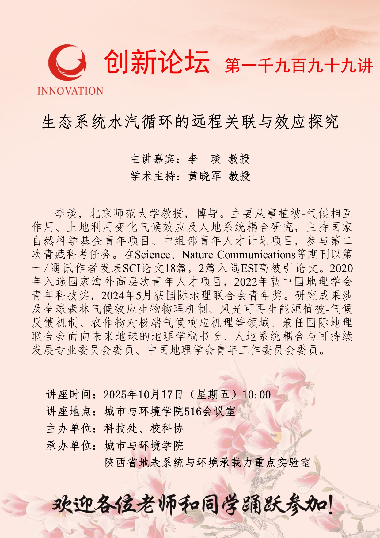 李 琰 教授 伟德国际1949始于英国创新论坛第一千九百九十九讲:生态系统水汽循环的远程关联与效应探究 讲座时间 2025年10月17日(星期五)10:00 讲座地点 城市与环境学院516会议室 讲座人介绍 李 琰 教授 讲座内容