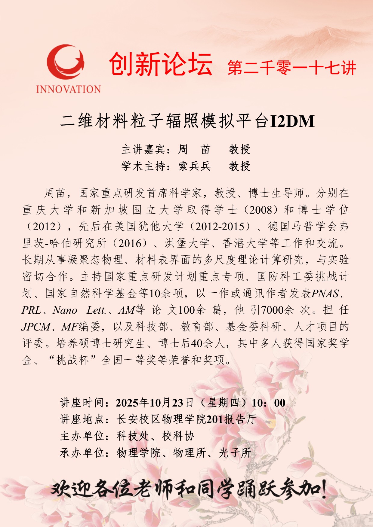 周苗 教授 伟德国际1949始于英国创新论坛第二千零一十七讲:二维材料粒子辐照模拟平台I2DM 讲座时间 2025年10月23日(星期四)10:00 讲座地点 长安校区物理学院201报告厅 讲座人介绍 周苗 教授 讲座内容