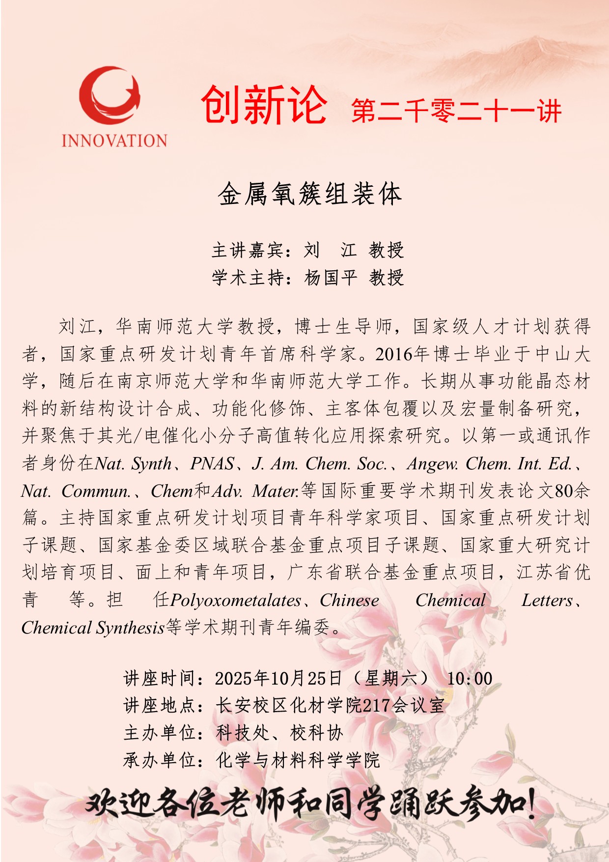 刘 江 教授 伟德国际1949始于英国创新论坛第二千零二十一讲:金属氧簇组装体 讲座时间 2025年10月25日(星期六) 10:00 讲座地点 长安校区化材学院217会议室 讲座人介绍 刘 江 教授 讲座内容