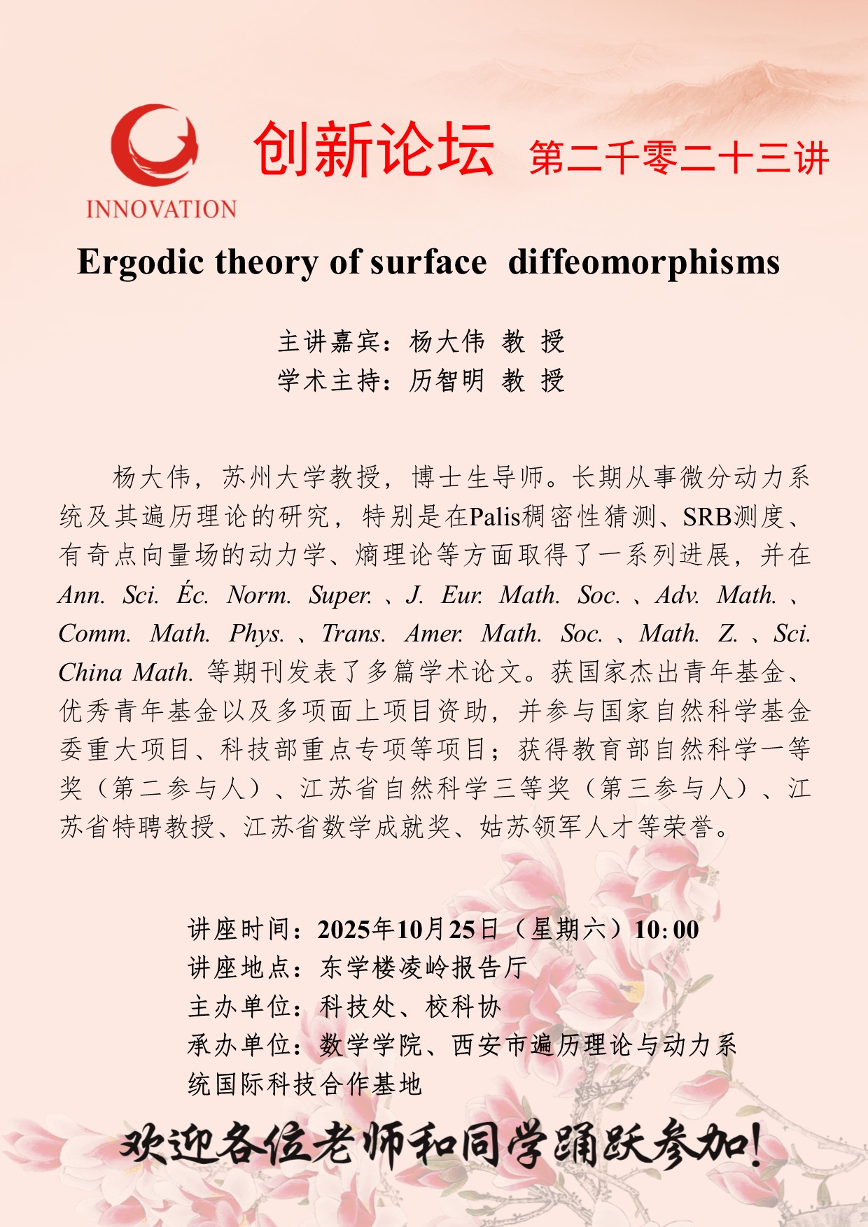 杨大伟 教 授 伟德国际1949始于英国创新论坛第二千零二十三讲:Ergodic theory of surface diffeomorphisms 讲座时间 2025年10月25日(星期六)10:00 讲座地点 东学楼凌岭报告厅 讲座人介绍 杨大伟 教 授 讲座内容