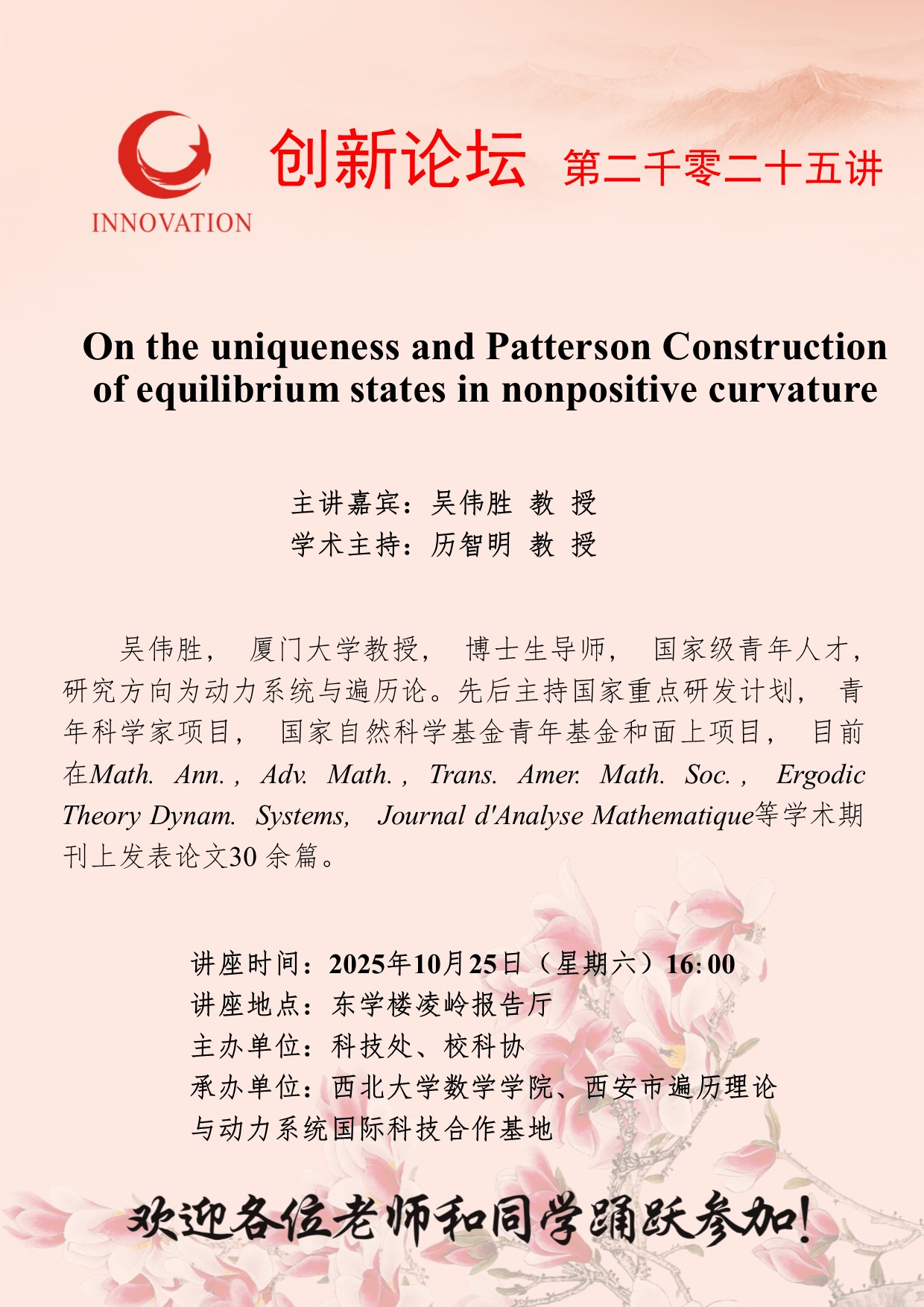 吴伟胜 教 授 伟德国际1949始于英国创新论坛第二千零二十五讲:On the uniqueness and Patterson Construction of equilibrium states in nonpositive curvature 讲座时间 2025年10月25日(星期六)16:00 讲座地点 东学楼凌岭报告厅 讲座人介绍 吴伟胜 教 授 讲座内容