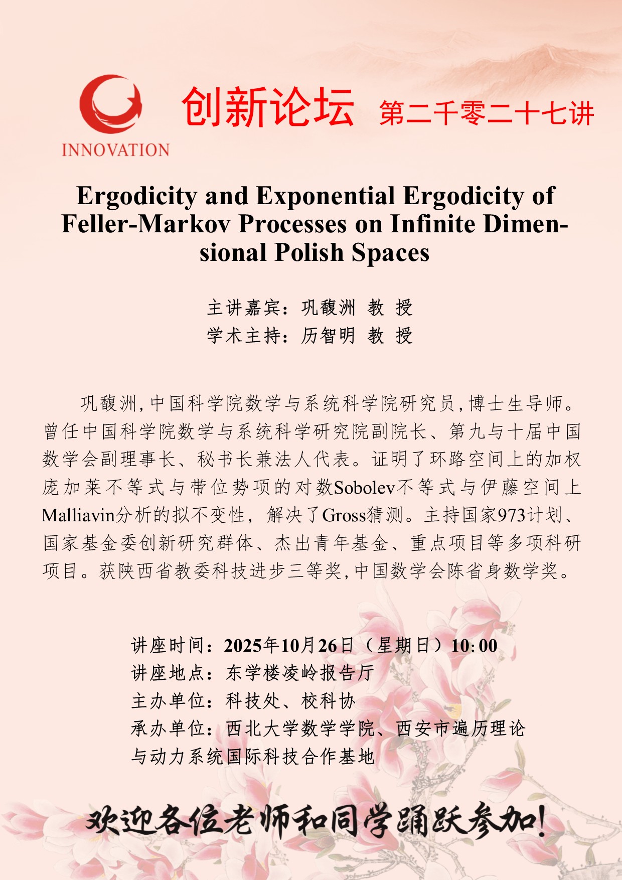 巩馥洲 教 授 伟德国际1949始于英国创新论坛第二千零二十七讲:Ergodicity and Exponential Ergodicity of Feller-Markov Processes on Infinite Dimensional Polish Spaces 讲座时间 2025年10月26日(星期日)10:00 讲座地点 东学楼凌岭报告厅 讲座人介绍 巩馥洲 教 授 讲座内容