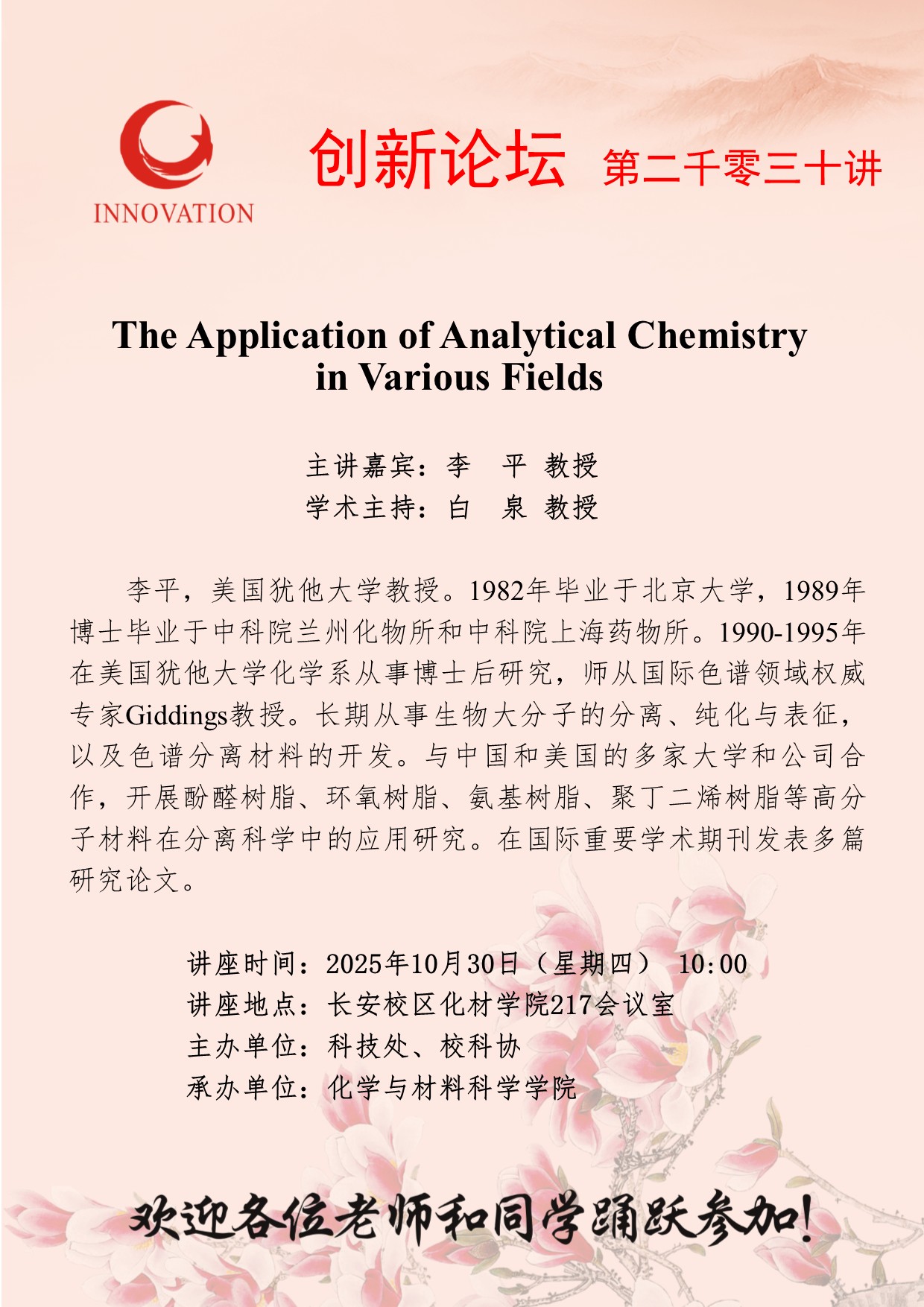 李 平 教授 伟德国际1949始于英国创新论坛第二千零三十讲:The Application of Analytical Chemistry in Various Fields 讲座时间 2025年10月30日(星期四) 10:00 讲座地点 长安校区化材学院217会议室 讲座人介绍 李 平 教授 讲座内容