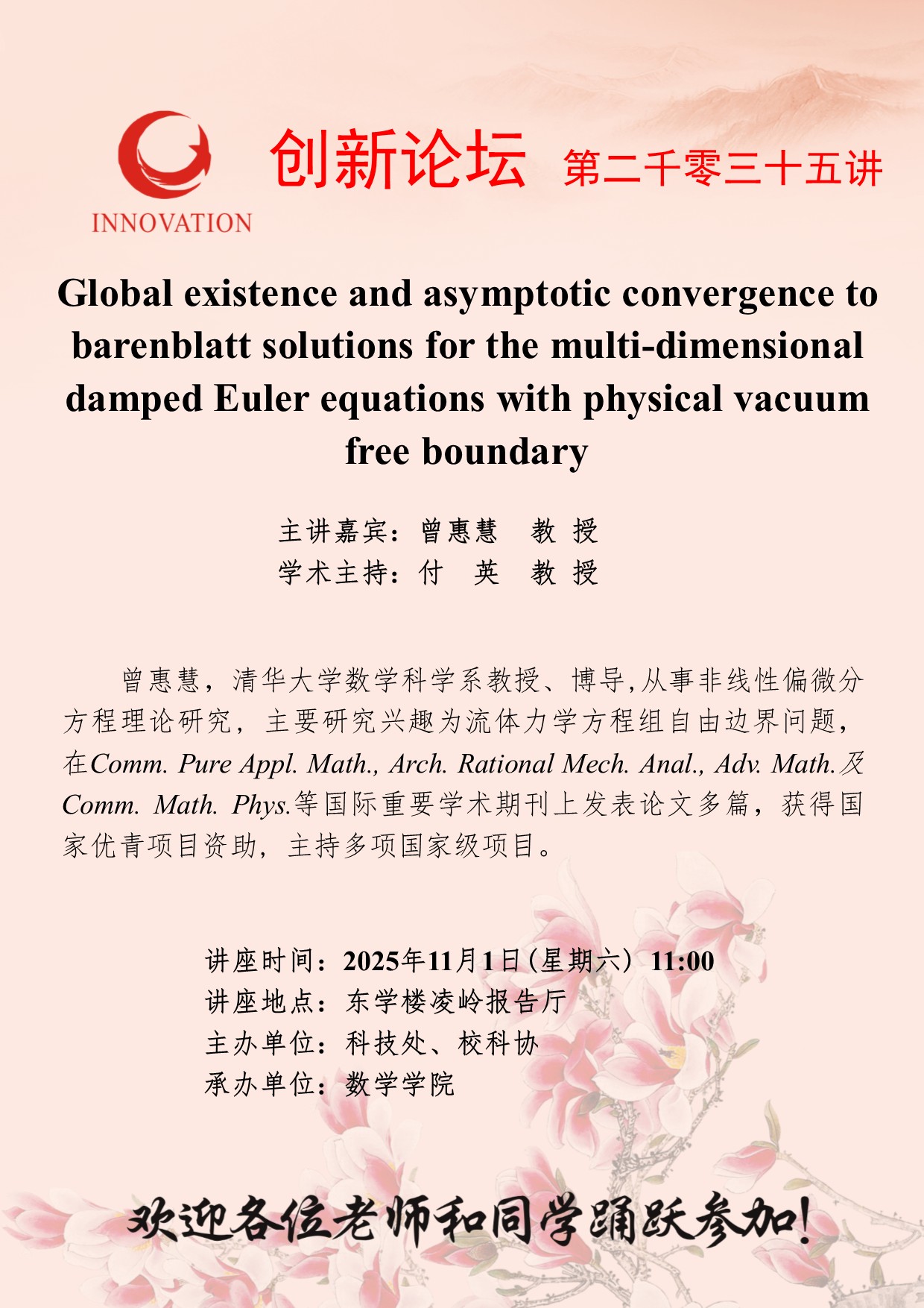 曾惠慧 教 授 伟德国际1949始于英国创新论坛第二千零三十五讲:Global existence and asymptotic convergence to barenblatt solutions for the multi-dimensional damped Euler equations with physical vacuum free boundary 讲座时间 2025年11月1日(星期六) 11:00 讲座地点 东学楼凌岭报告厅 讲座人介绍 曾惠慧 教 授 讲座内容