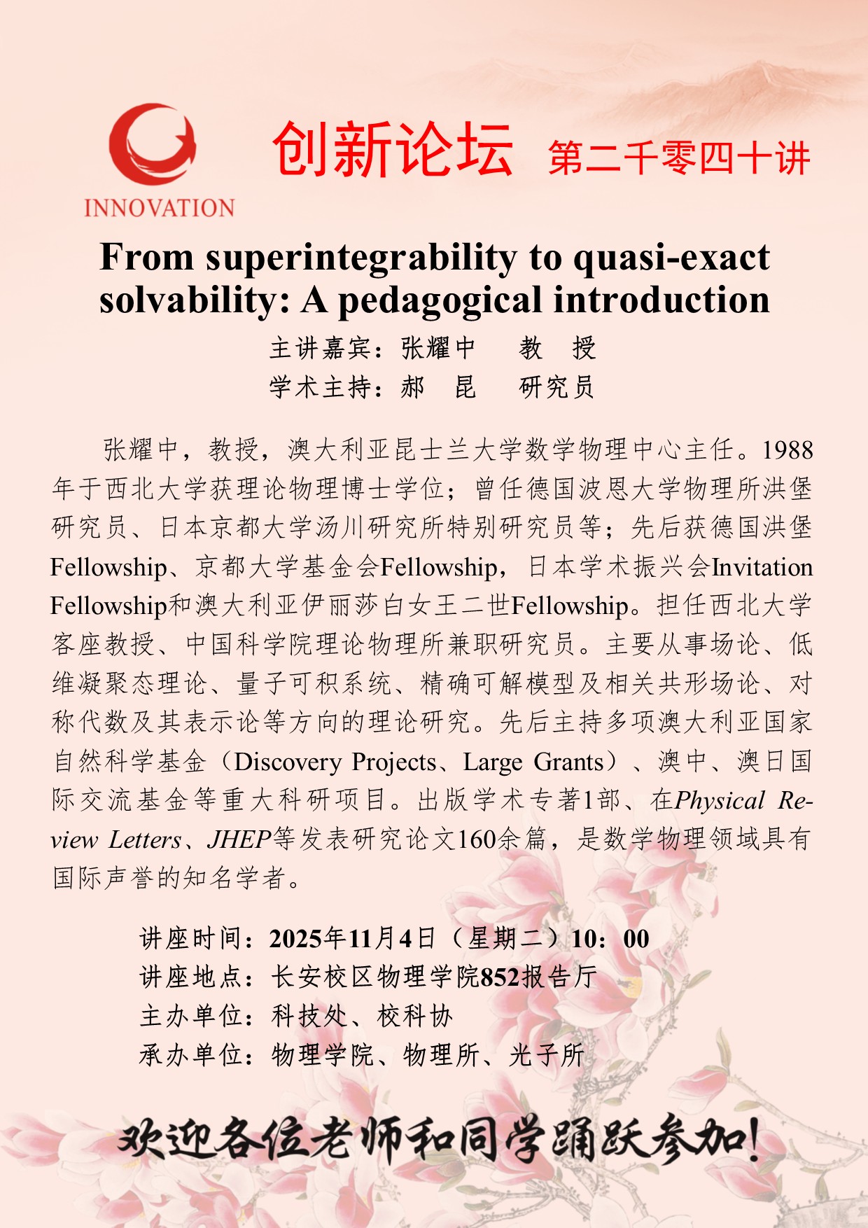 张耀中 教授 伟德国际1949始于英国创新论坛第二千零四十讲:From superintegrability to quasi-exact solvability: A pedagogical introduction 讲座时间 2025年11月4日(星期二)10:00 讲座地点 长安校区物理学院852报告厅 讲座人介绍 张耀中 教授 讲座内容