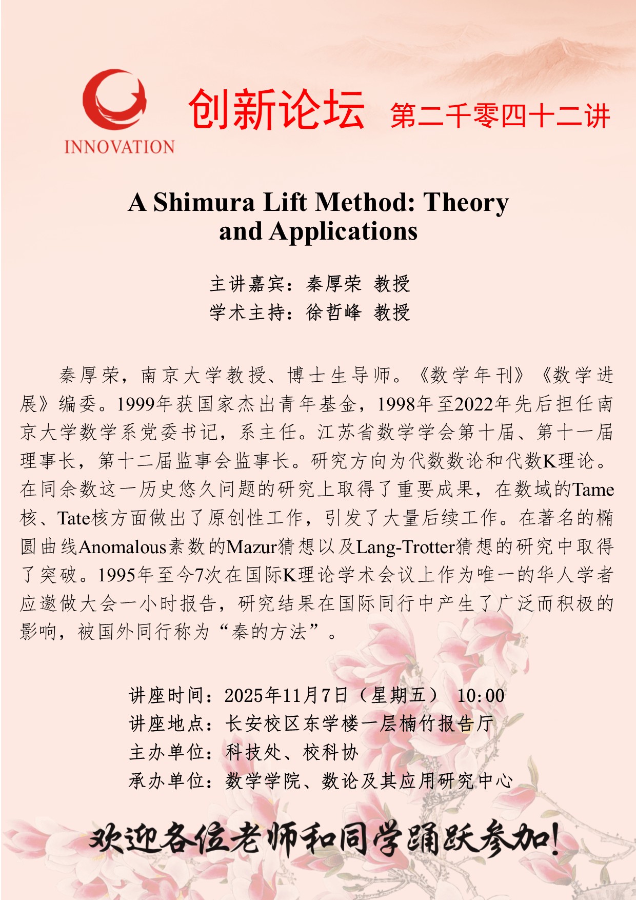 秦厚荣 教授 伟德国际1949始于英国创新论坛第二千零四十二讲:A Shimura Lift Method: Theory and Applications 讲座时间 2025年11月7日(星期五) 10:00 讲座地点 长安校区东学楼一层楠竹报告厅 讲座人介绍 秦厚荣 教授 讲座内容