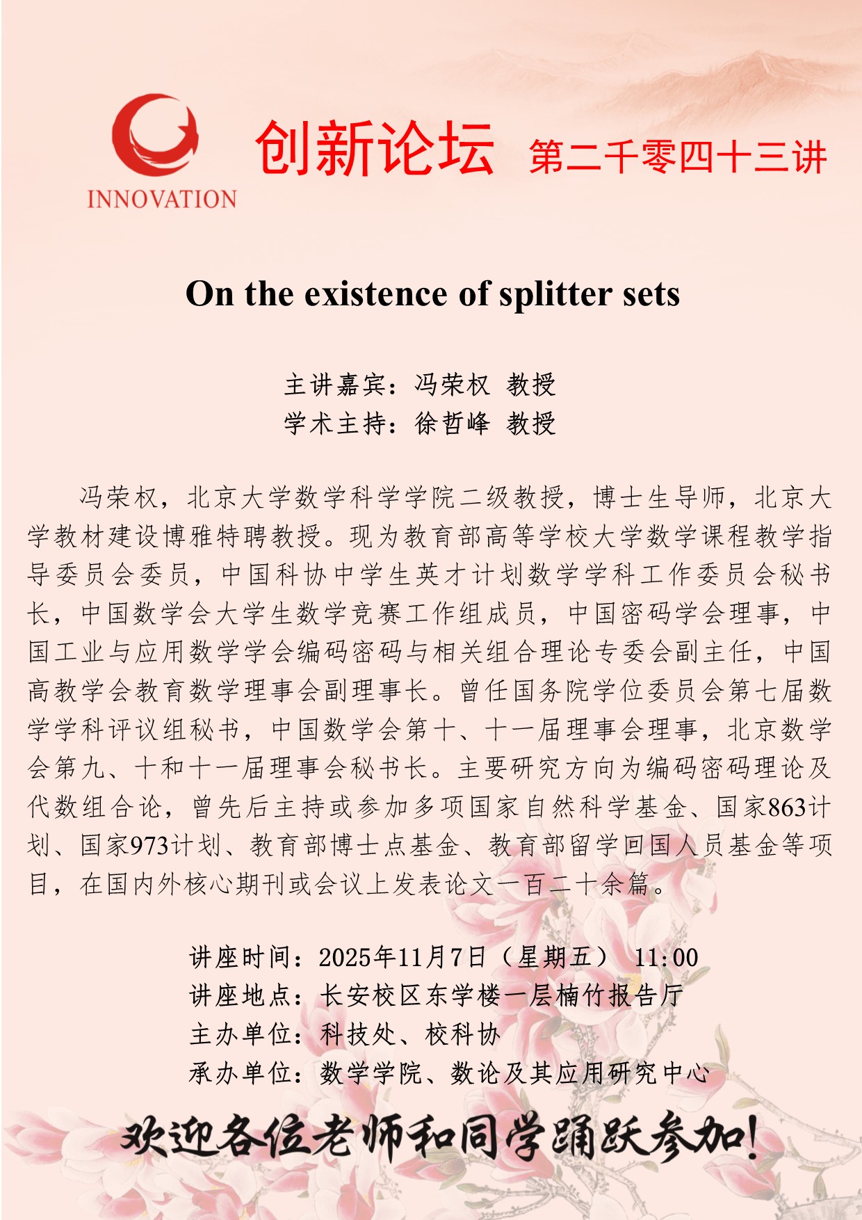 冯荣权 教授 伟德国际1949始于英国创新论坛第二千零四十三讲:On the existence of splitter sets 讲座时间 2025年11月7日(星期五) 11:00 讲座地点 长安校区东学楼一层楠竹报告厅 讲座人介绍 冯荣权 教授 讲座内容