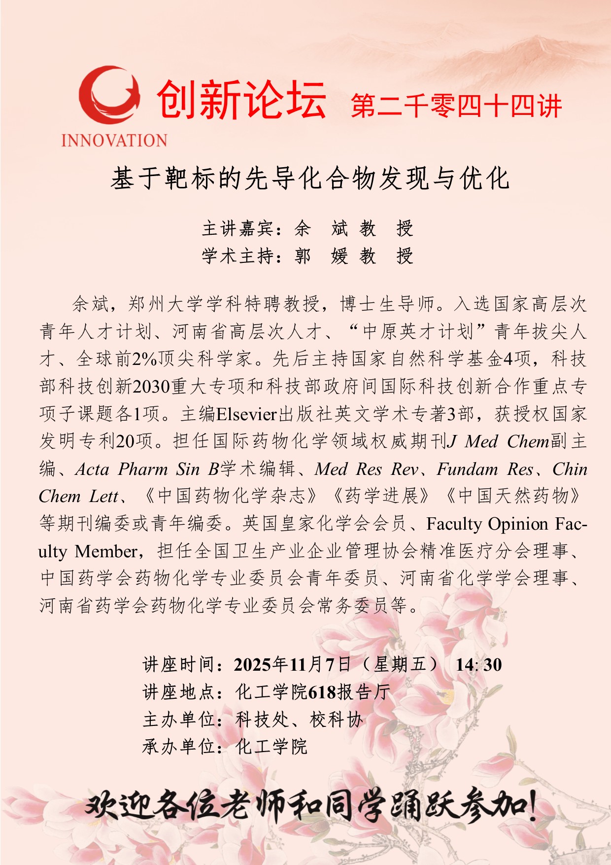 余斌 教授 伟德国际1949始于英国创新论坛第二千零四十四讲:基于靶标的先导化合物发现与优化 讲座时间 2025年11月7日(星期五) 14: 30 讲座地点 化工学院618报告厅 讲座人介绍 余斌 教授 讲座内容