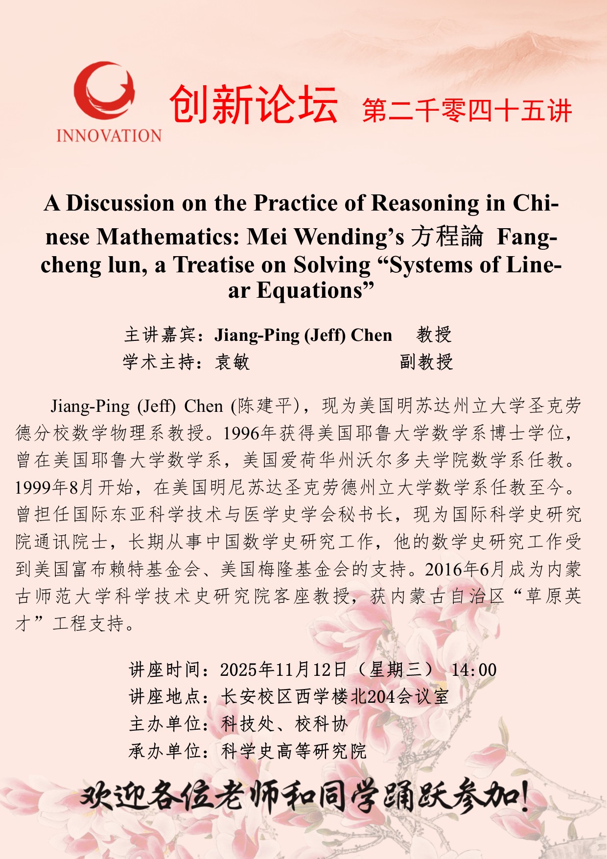 Jiang-Ping (Jeff) Chen 教授 伟德国际1949始于英国创新论坛第二千零四十五讲:A Discussion on the Practice of Reasoning in Chinese Mathematics: Mei Wending’s 方程論 Fangcheng lun, a Treatise on Solving “Systems of Linear Equations” 讲座时间 2025年11月12日(星期三) 14:00 讲座地点 长安校区西学楼北204会议室 讲座人介绍 Jiang-Ping (Jeff) Chen 教授 讲座内容