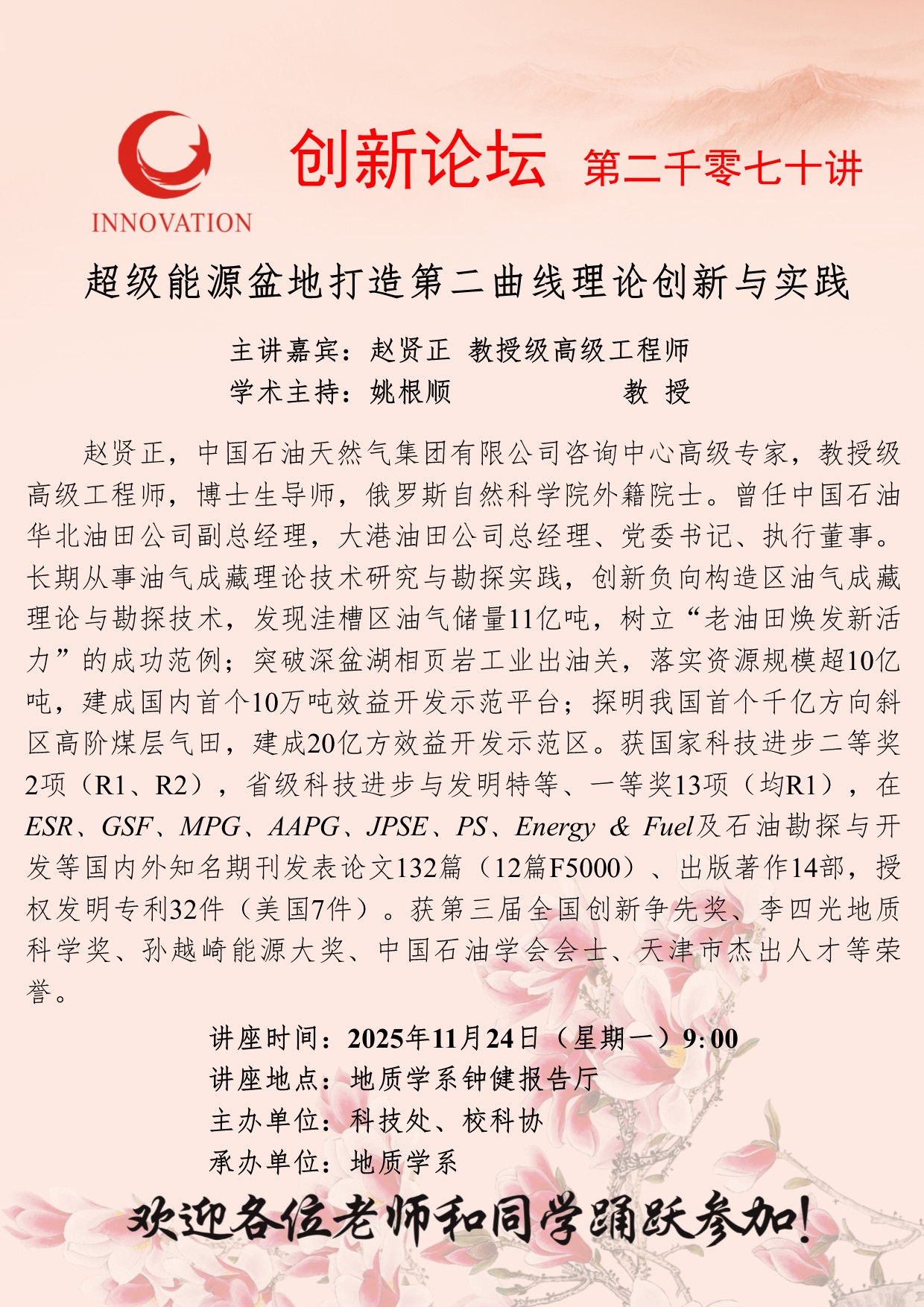 赵贤正 教授级高级工程师 伟德国际1949始于英国创新论坛第二千零七十讲:超级能源盆地打造第二曲线理论创新与实践 讲座时间 2025年11月24日(星期一)9:00 讲座地点 地质学系钟健报告厅 讲座人介绍 赵贤正 教授级高级工程师 讲座内容