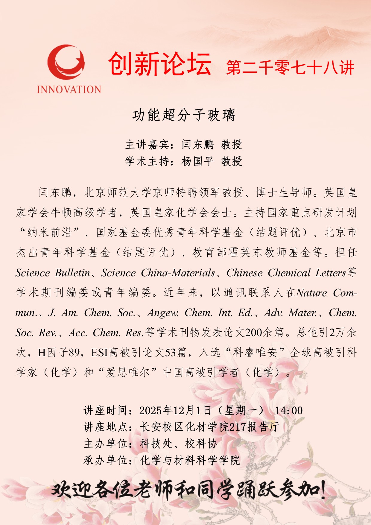 闫东鹏 教授 伟德国际1949始于英国创新论坛第二千零七十八讲:功能超分子玻璃 讲座时间 2025年12月1日(星期一) 14:00 讲座地点 长安校区化材学院217报告厅 讲座人介绍 闫东鹏 教授 讲座内容