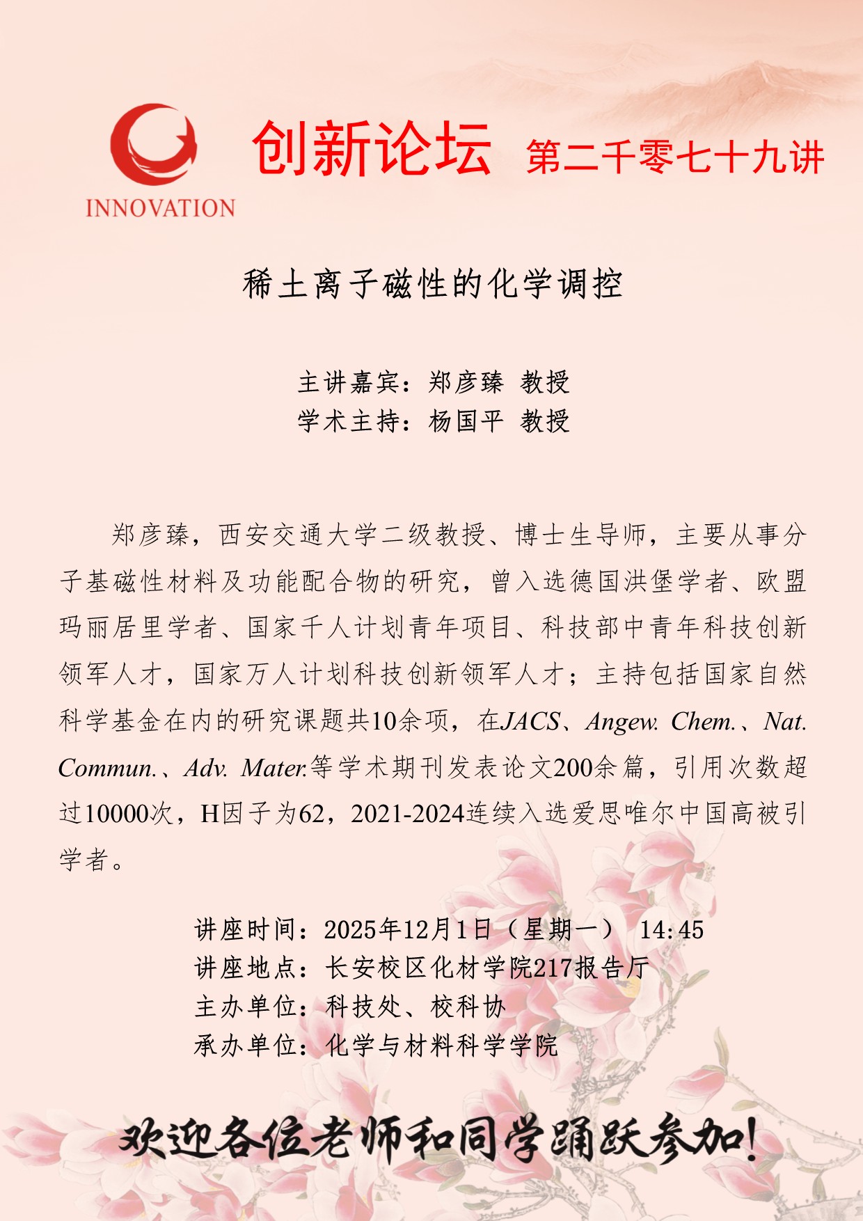 郑彦臻 教授 伟德国际1949始于英国创新论坛第二千零七十九讲:稀土离子磁性的化学调控 讲座时间 2025年12月1日(星期一) 14:45 讲座地点 长安校区化材学院217报告厅 讲座人介绍 郑彦臻 教授 讲座内容