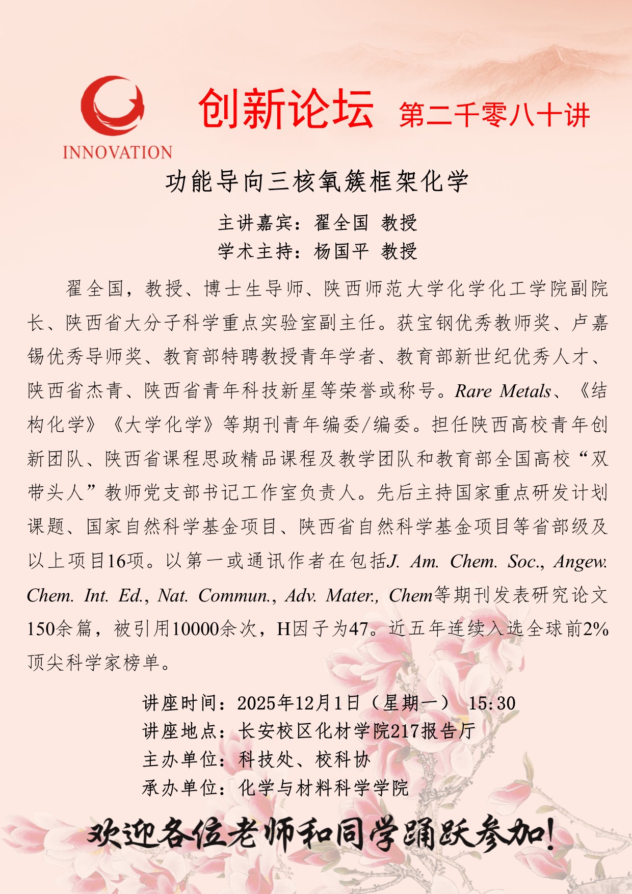 翟全国 教授 伟德国际1949始于英国创新论坛第二千零八十讲:功能导向三核氧簇框架化学 讲座时间 2025年12月1日(星期一) 15:30 讲座地点 长安校区化材学院217报告厅 讲座人介绍 翟全国 教授 讲座内容