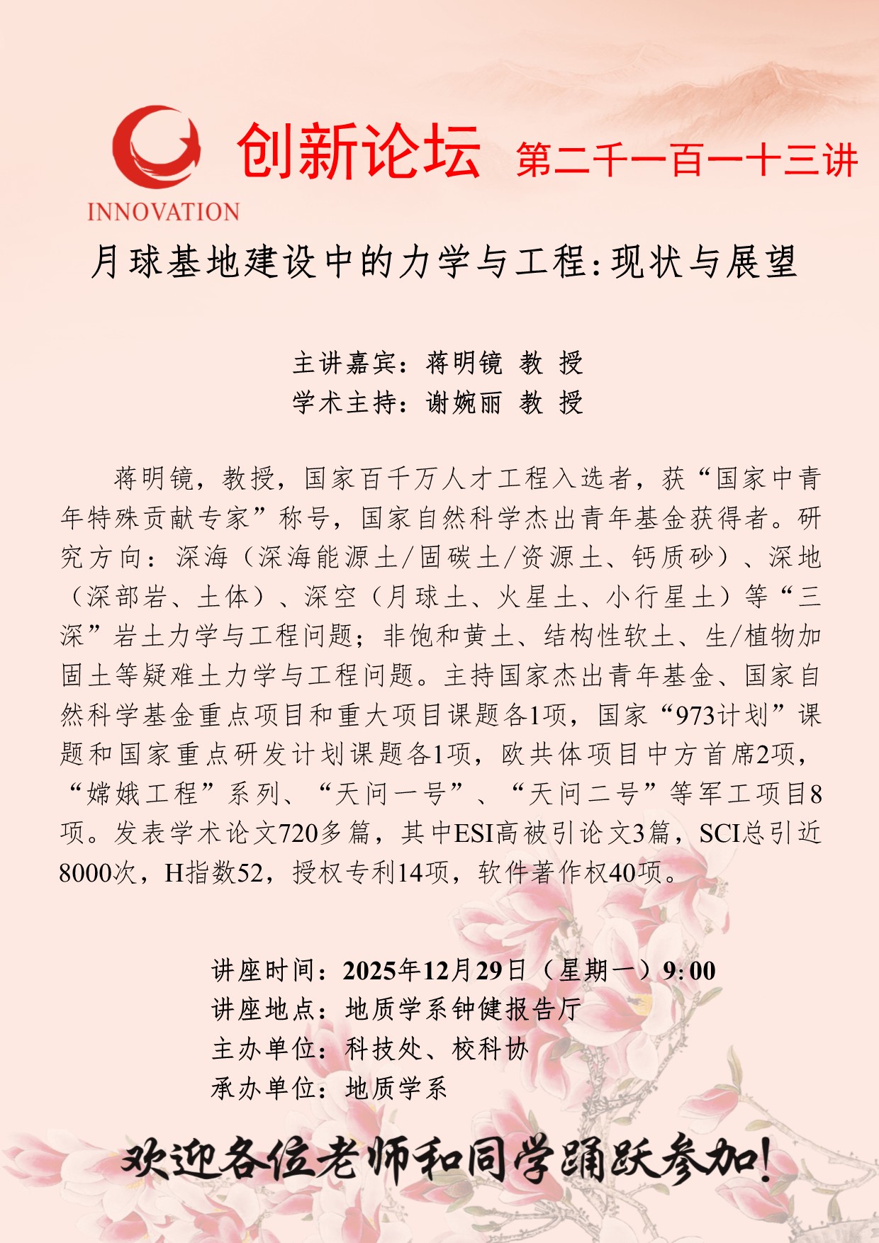 蒋明镜 教授 伟德国际1949始于英国创新论坛第二千一百一十三讲:月球基地建设中的力学与工程:现状与展望 讲座时间 2025年12月29日(星期一)9:00 讲座地点 地质学系钟健报告厅 讲座人介绍 蒋明镜 教授 讲座内容