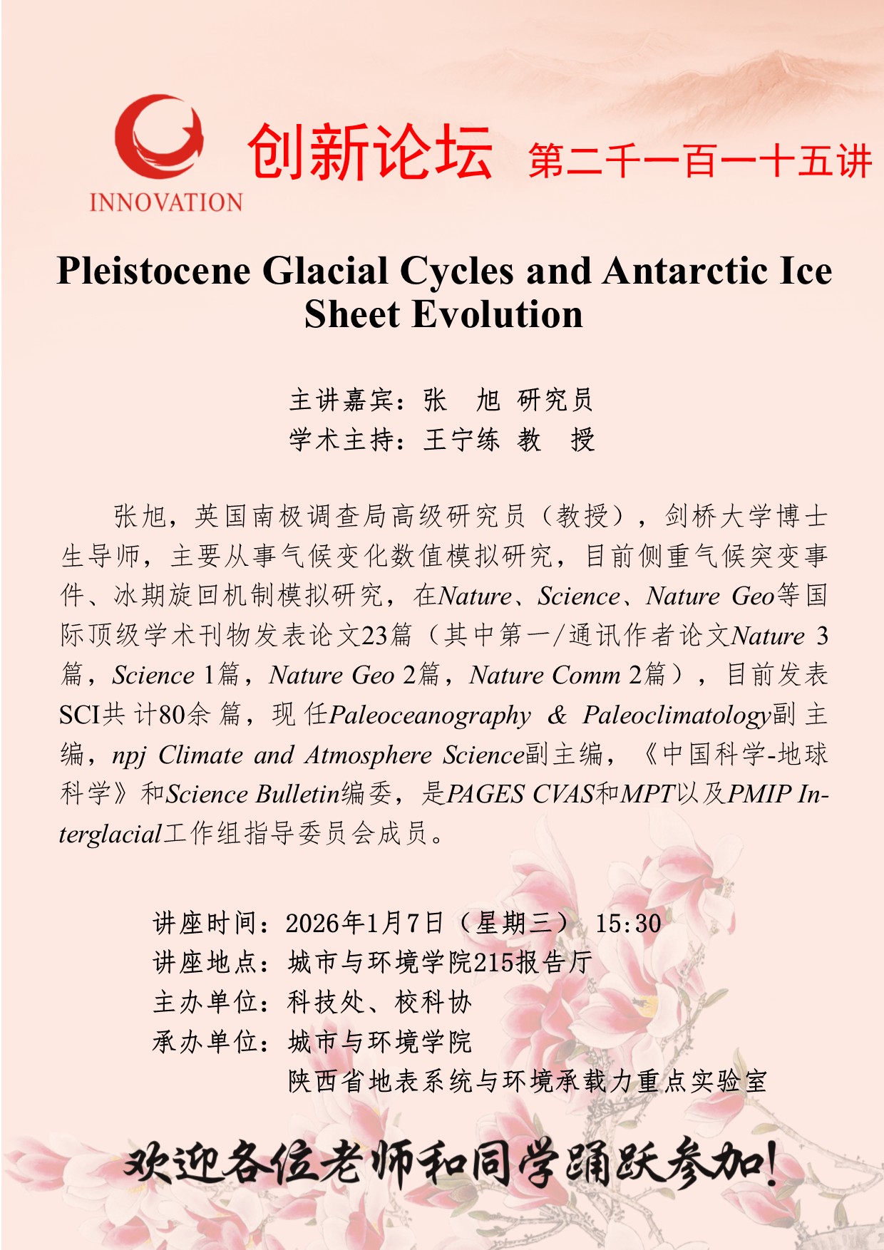 张 旭 研究员 伟德国际1949始于英国创新论坛第二千一百一十五讲:Pleistocene Glacial Cycles and Antarctic Ice Sheet Evolution 讲座时间 2026年1月7日(星期三) 15:30 讲座地点 城市与环境学院215报告厅 讲座人介绍 张 旭 研究员 讲座内容